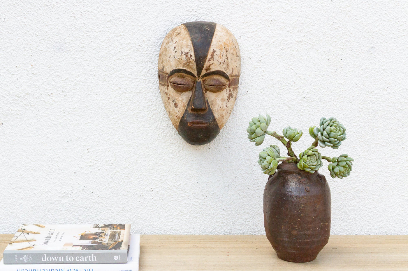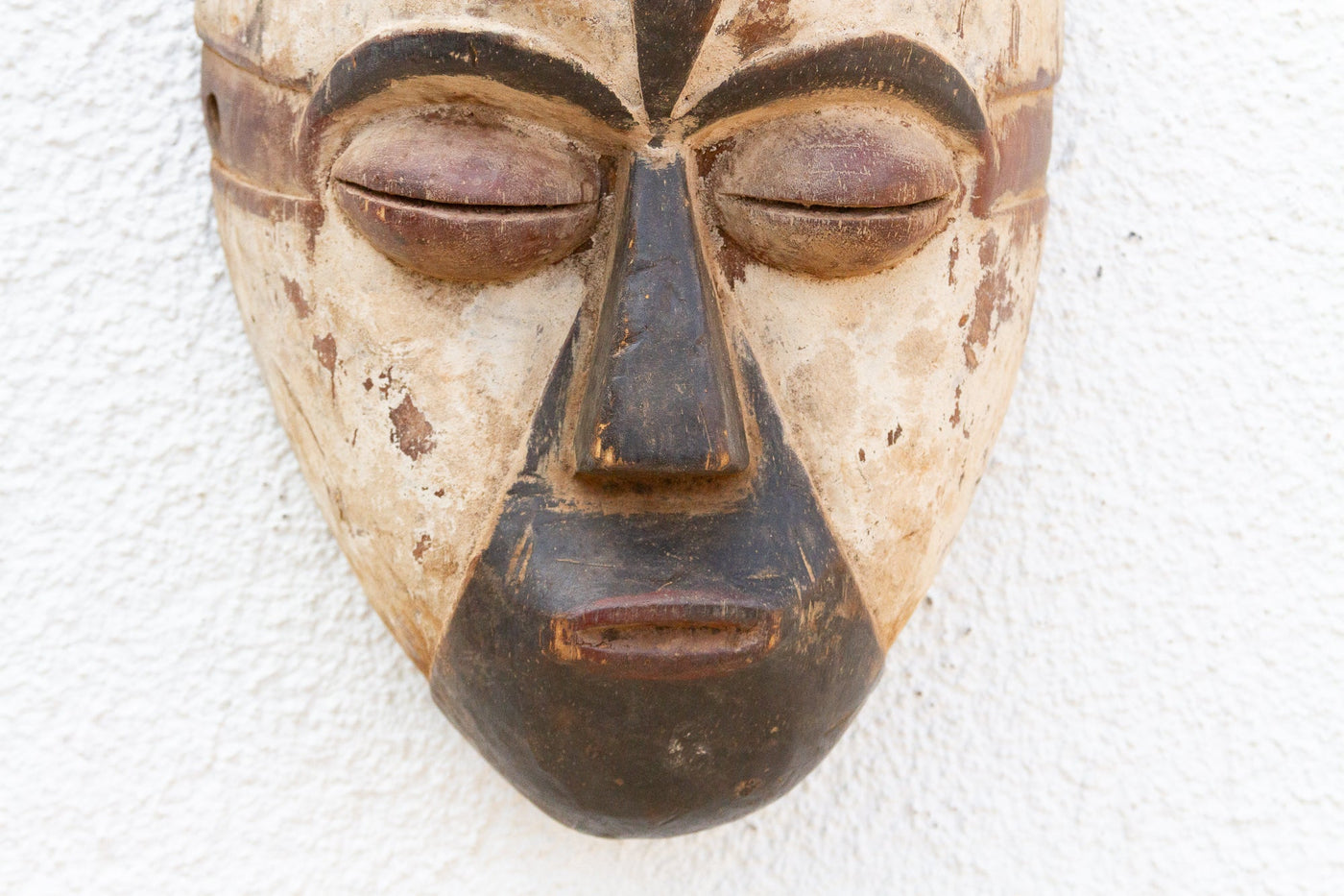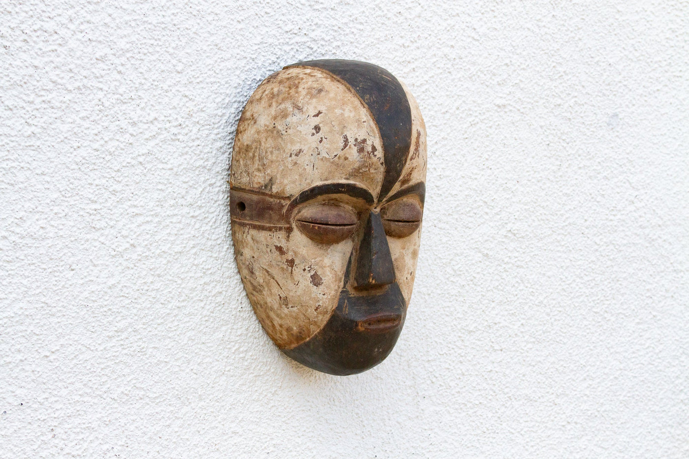 This elegant Fang Ngil mask from Gabon is a captivating example of African tribal art. The mask is characterized by its elongated form, with a long, narrow face, a prominent forehead, and a slightly open mouth. The surface is adorned with scarification marks and a rich, dark patina, which contrasts beautifully with the lighter-colored accents around the eyes and mouth. These accents may represent tribal tattoos or scarification marks, adding a layer of intrigue and cultural significance. Ngil masks were often used to represent ancestral spirits and were believed to guide and protect communities, particularly in matters of justice and social harmony. This mask would not only be a fascinating addition to any collection of African art but also a captivating focal point in a modern home. Imagine it displayed in a library, office, or living room, adding a touch of cultural richness and mystique. Its elegant form and contrasting colors would complement a variety of interiors, from minimalist and contemporary to eclectic and bohemian. Consider pairing it with natural textures, like wood and woven fabrics, and warm earth tones to create a grounded and sophisticated space.