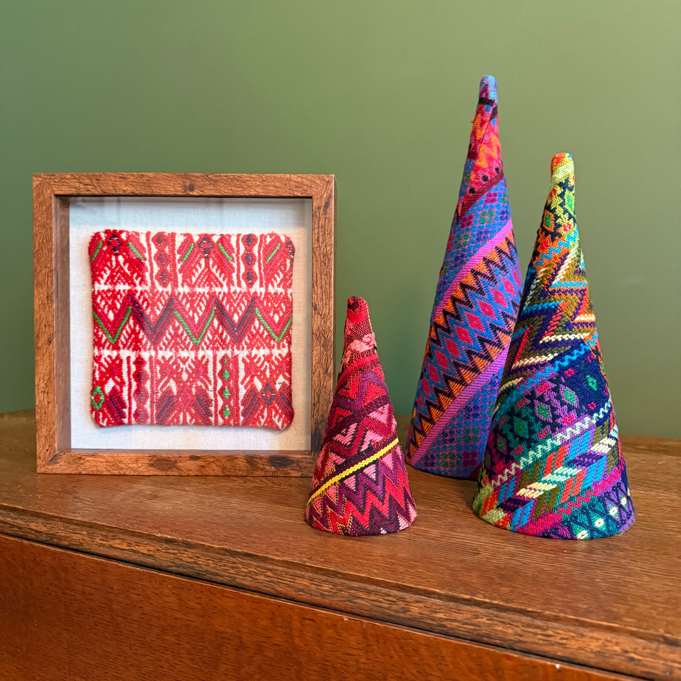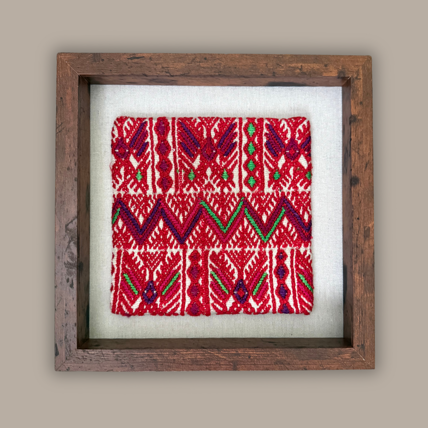 Vintage Mayan huipil (handwoven blouse) pieces are transformed into framed wall art by Greensboro, NC, Afghan refugees. A showcase of Mayan culture and Afghan resilience. And, no waste!