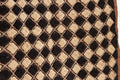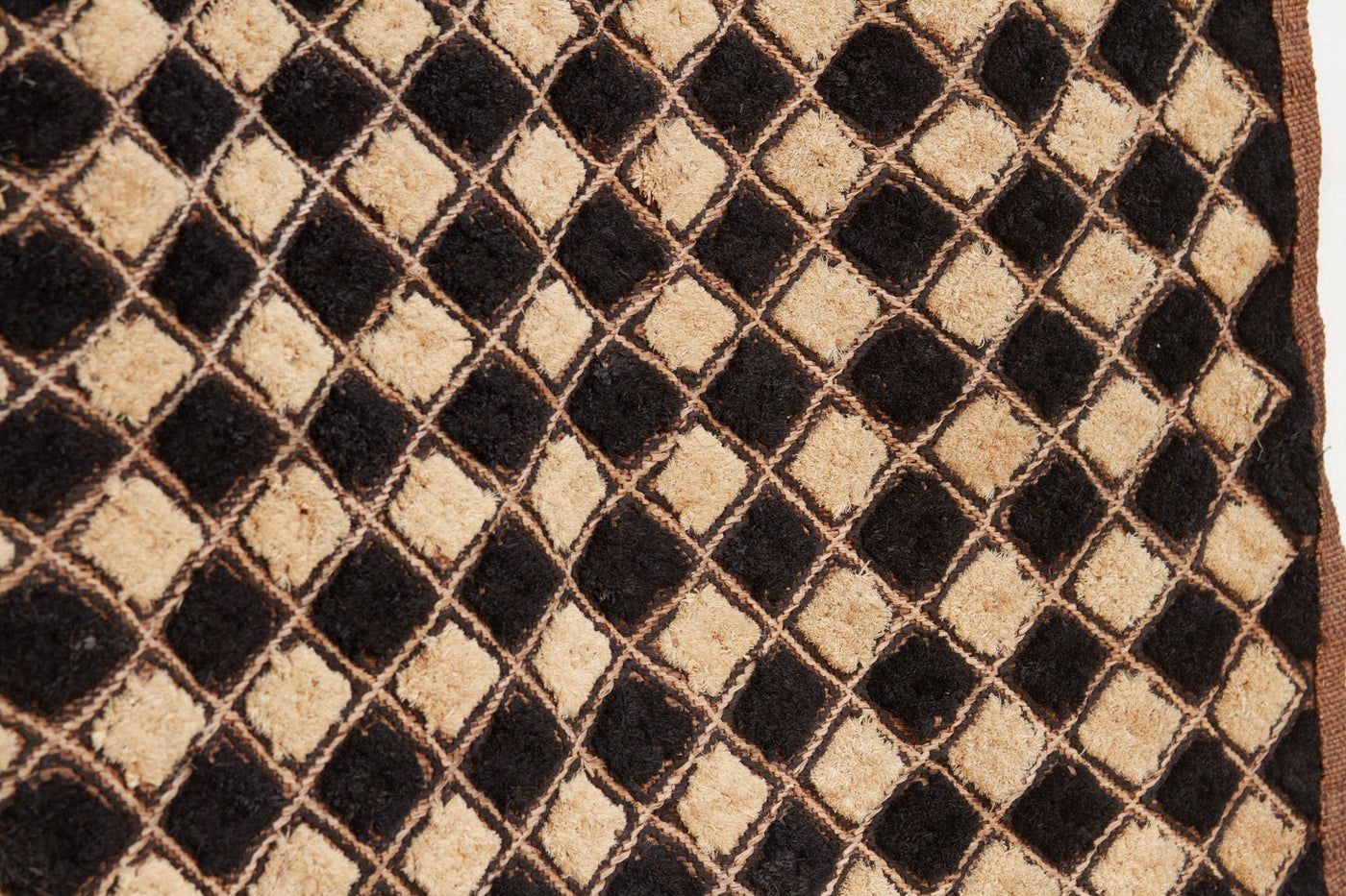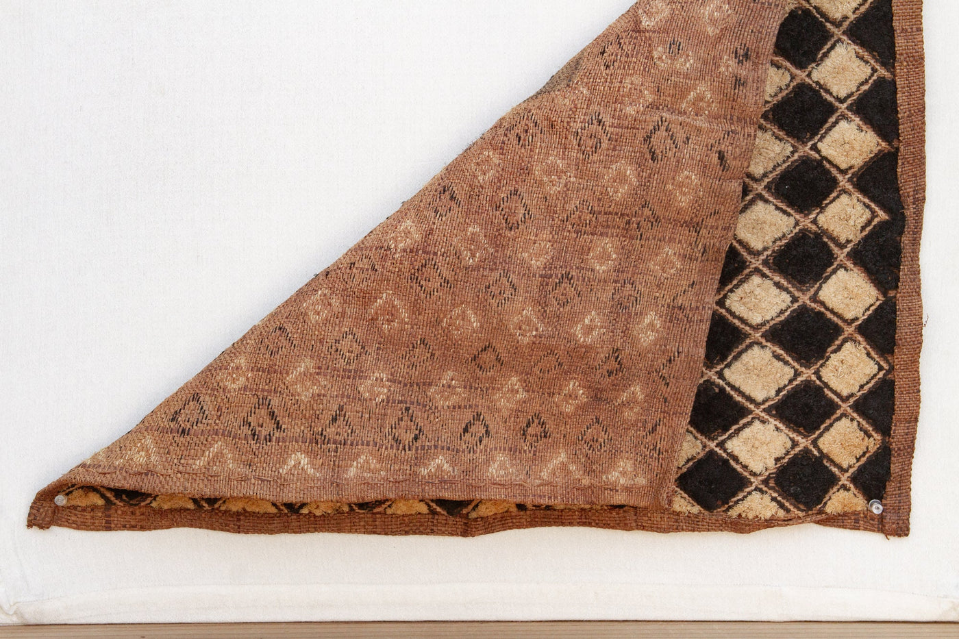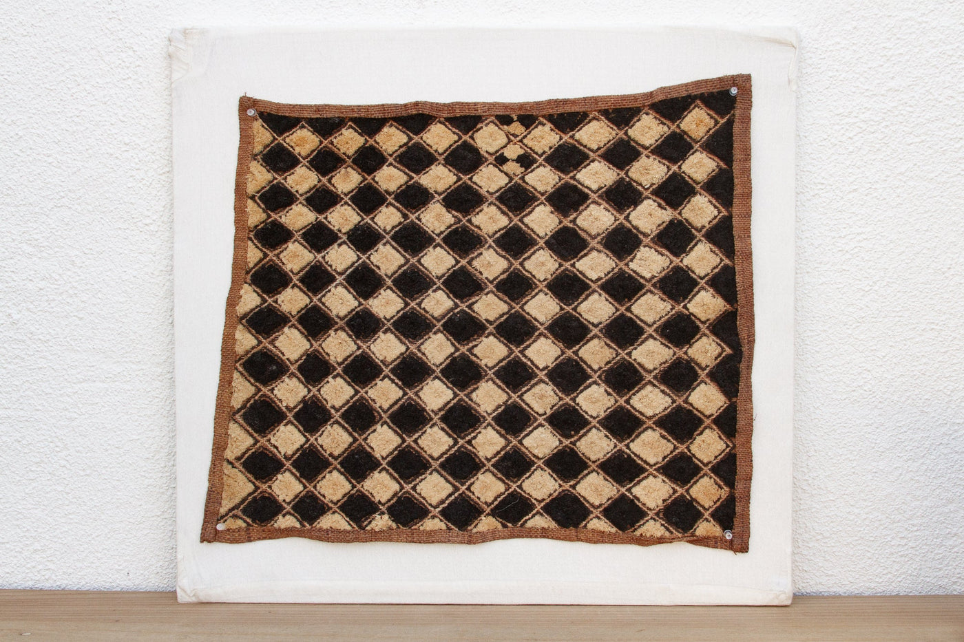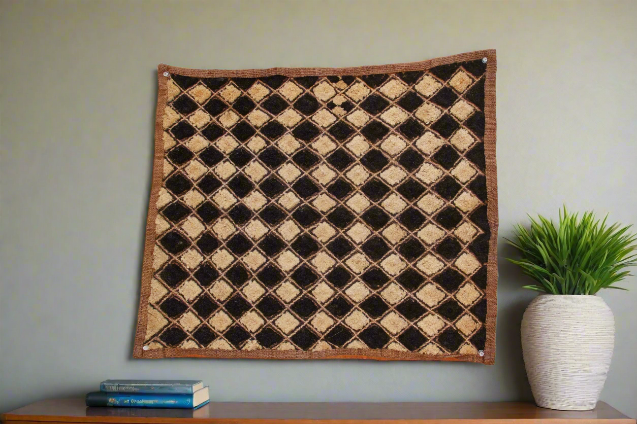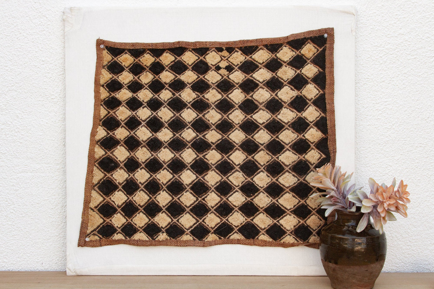 A captivating masterpiece of African textile art, this vintage Kuba cloth panel is a testament to the unparalleled craftsmanship of the Kuba people. Hailing from the Democratic Republic of Congo, this handwoven treasure showcases intricate geometric patterns meticulously embroidered with natural fibers. The Kuba people's artistry is evident in the unique "cut pile" technique, where raffia fibers are skillfully cut and knotted to create a rich, textured surface adorned with symbolic designs. Each pattern on this Kuba cloth tells a story, reflecting the Kuba people's deep-rooted beliefs, social hierarchy, and spiritual connections.