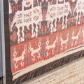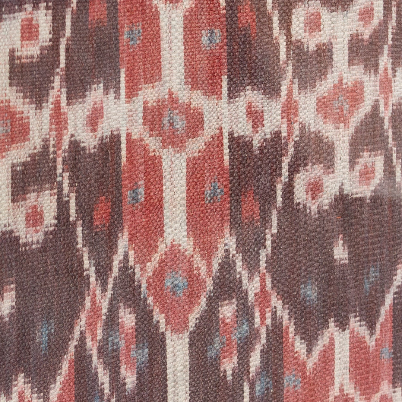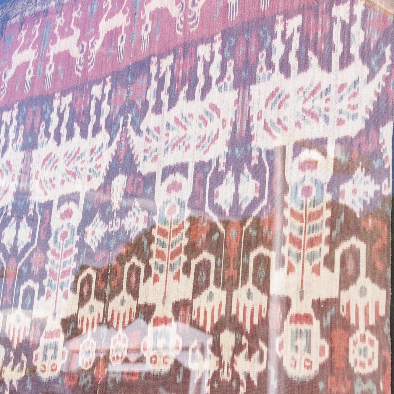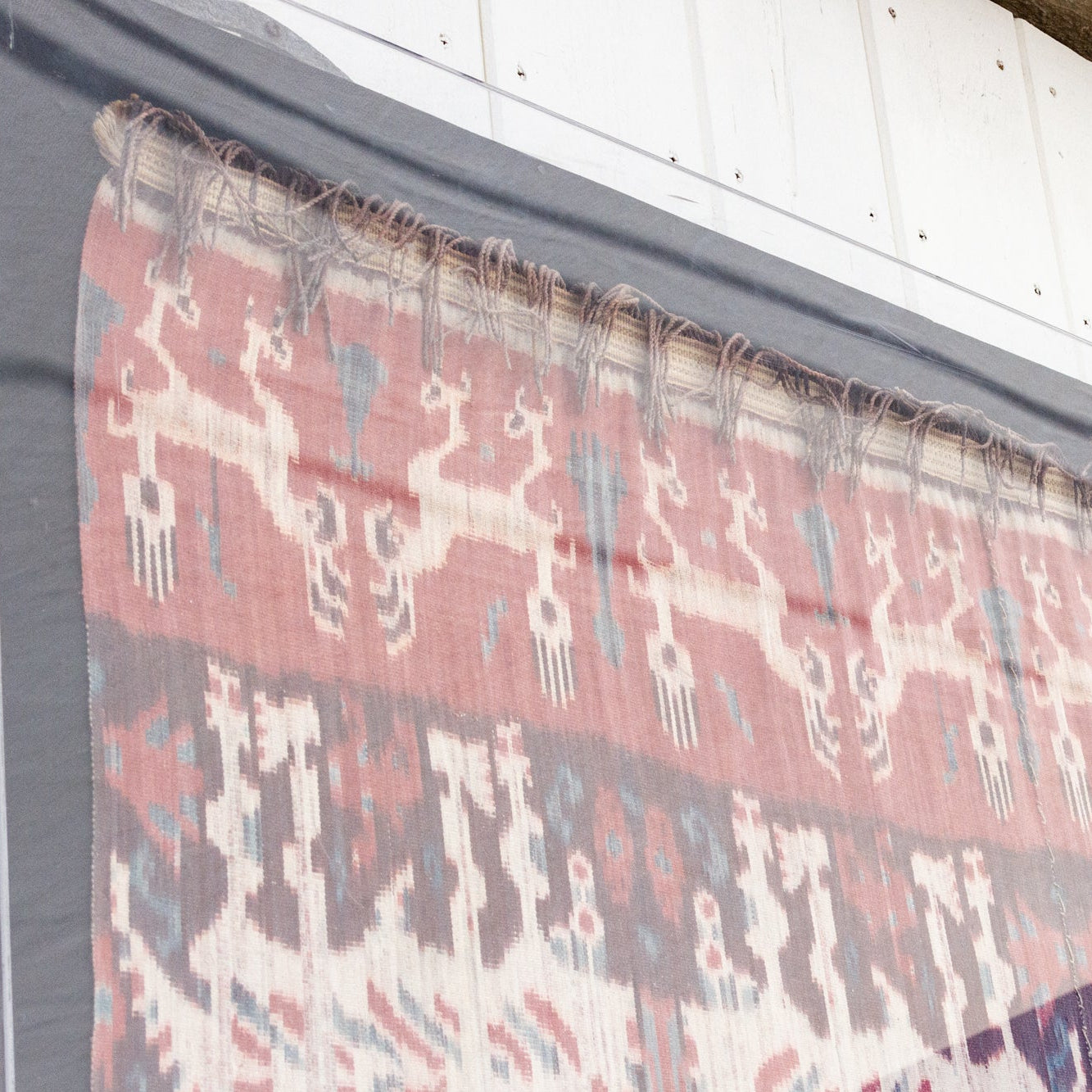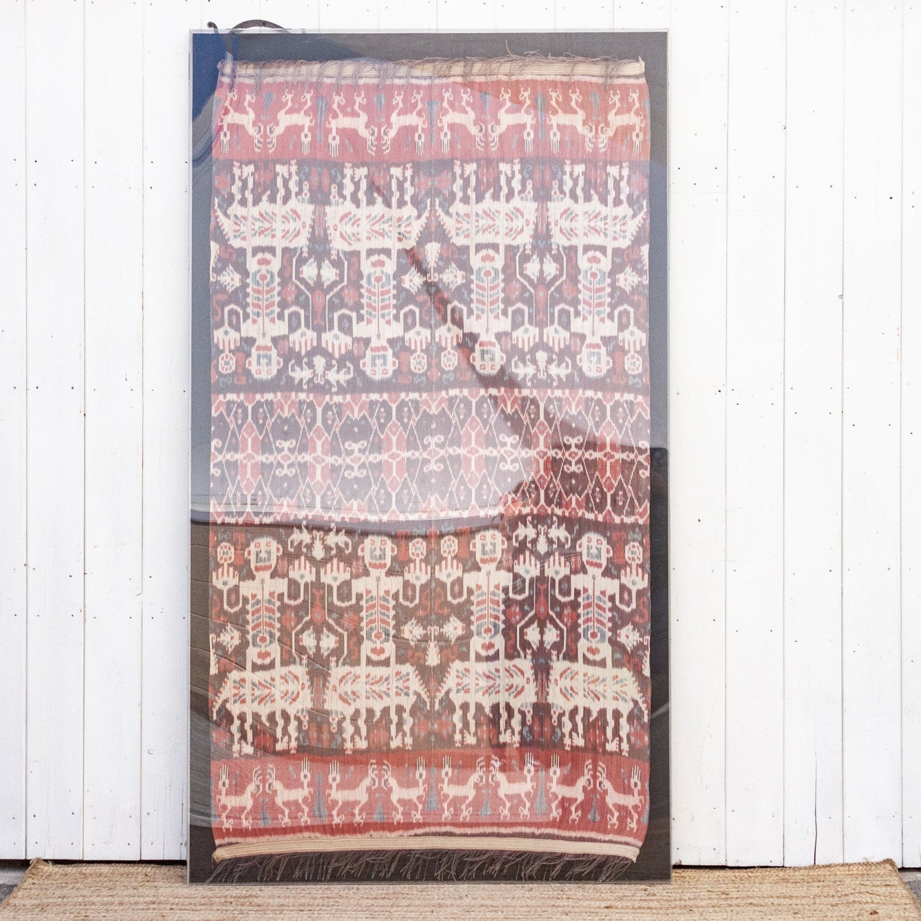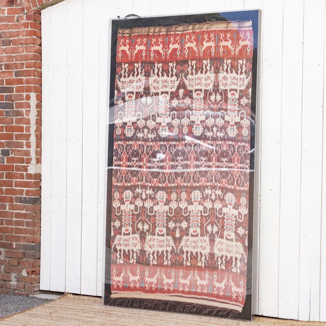 A magnificent antique Indonesianikat ceremonial throw, now encased in a custom plexiglass frame. This antique ceremonial throw showcases a remarkable weaving technique, presenting eight commanding human figures, each adorned with skull-like heads. Originating from the island of Sumatra, this antique Ikat carries an aura of tradition and heritage. Its color palette, composed of rich brick red, creamy tones, and earthy browns, reflects the warmth of ancient craftsmanship and the passage of time. Meticulously preserved within a custom plexiglass frame, this ceremonial masterpiece gains a new level of appreciation and makes for a showcase piece of art.