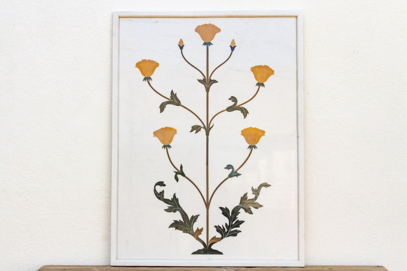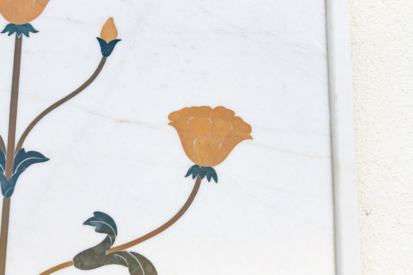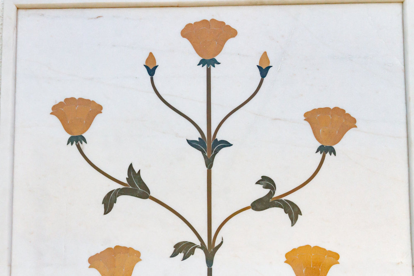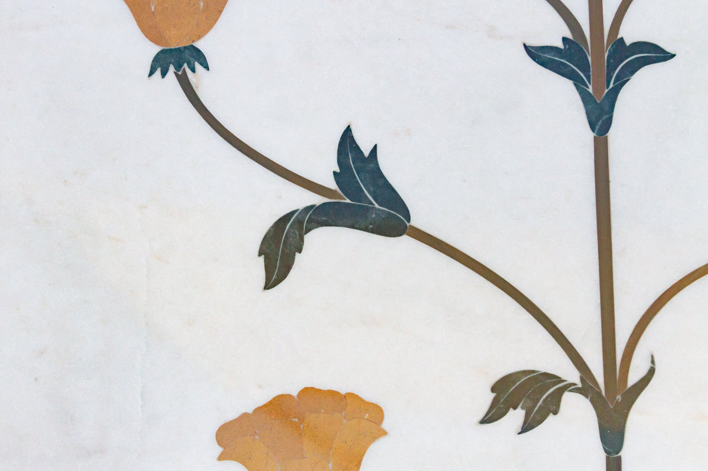 This Indian marble wall panel is finely inlay with semi-precious stones, skillfully arranged to create stunning botanical designs. Each panel is meticulously crafted by skilled artisans who carefully select and cut semi-precious stones such as lapis lazuli, malachite, agate, and coral. These stones are then intricately inlaid into the marble, forming breathtaking patterns of flowers, leaves, and other botanical motifs. The vibrant colors and delicate details of the inlay work evoke a sense of timeless elegance and beauty. These marble Inlay panels were historically used to decorate palaces and temples in India. Today they add a touch of timeless beauty and elegance to contemporary spaces as wall art, table top or precious tray.