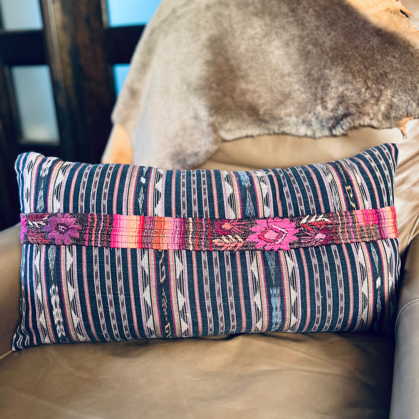 Sustainably made, this Intertwined handmade throw pillow is crafted from a second-hand Mayan corte (skirt), handwoven by women in Guatemala. Soft and stone-washed, the corte fabric is sewn together with 100% cotton backing by Afghan refugees in North Carolina.