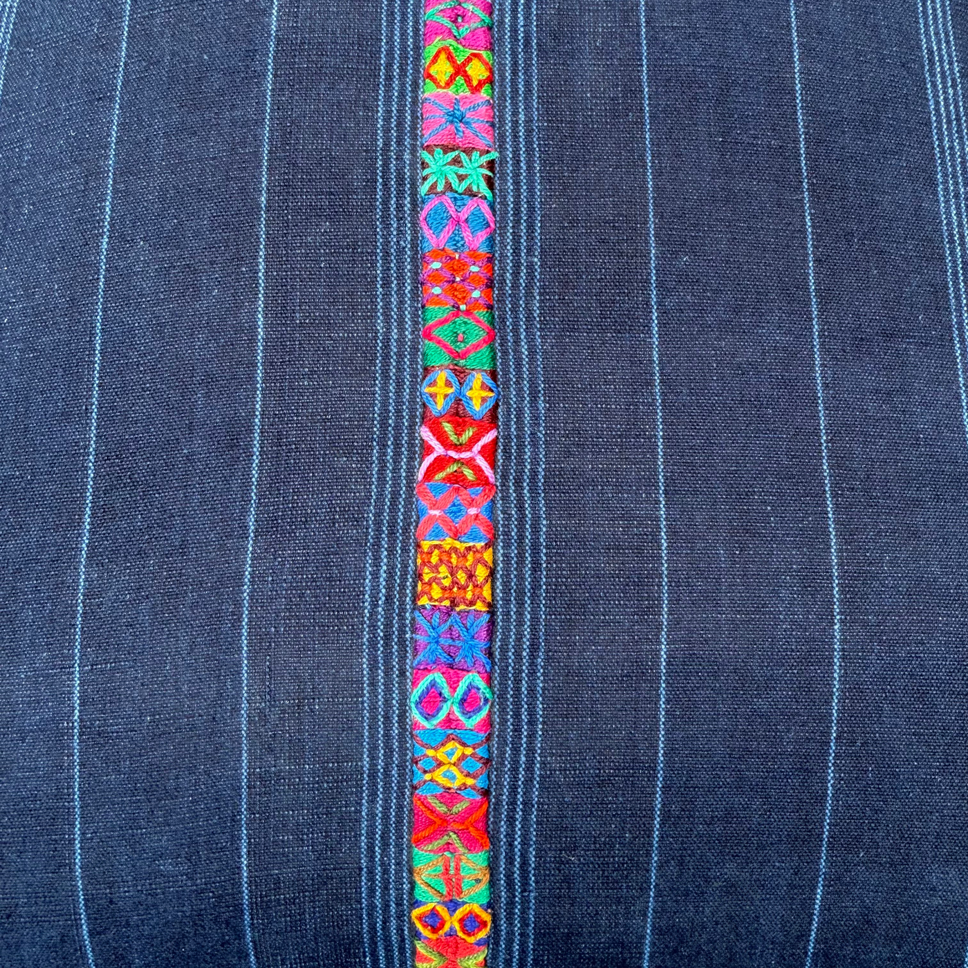 Add a touch of culture and sustainability to your home with Intertwined's handwoven vintage indigo pillow made from a traditional Mayan corte skirt. Embroidered accents and expert tailoring by Ruth & Naomi in Guatemala make this a unique and cheerful addition to your sofa or bed.