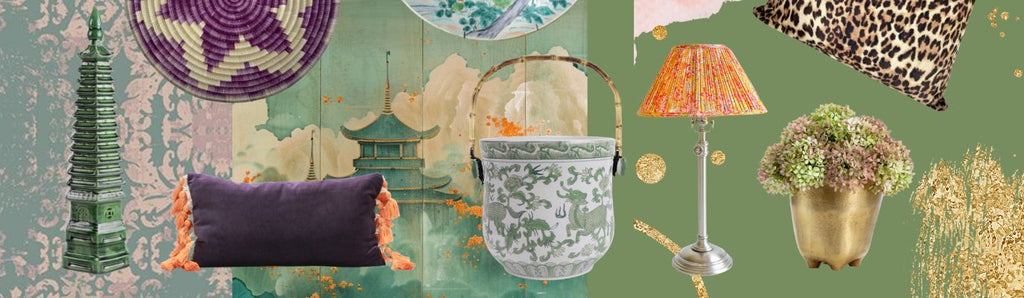 Deep violet and dusty mauve mixed with Dill Green. Velvet upholstery, antique brass lighting and smoked-glass vases.