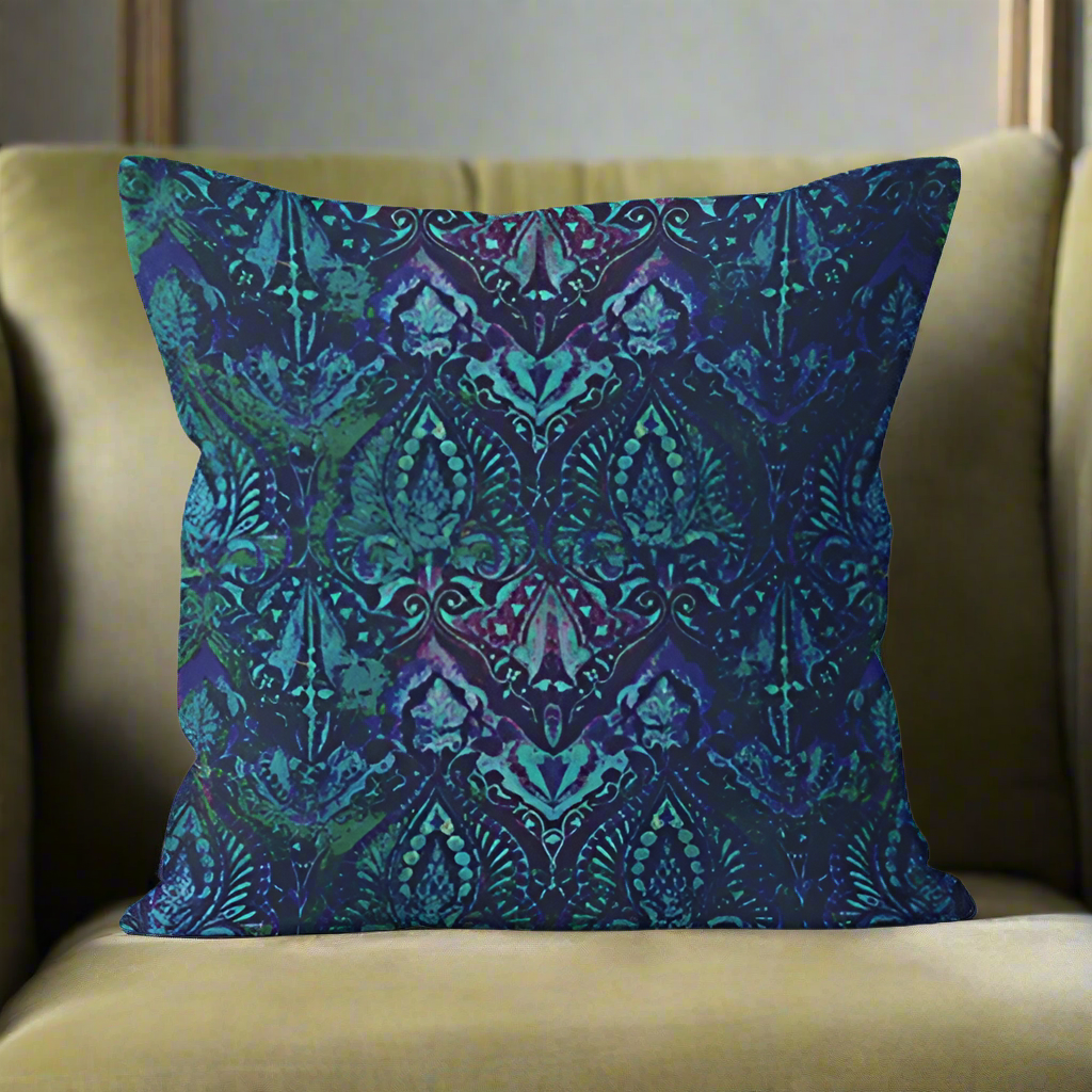 Reminiscent of paisleys and Indian saris, the Neela Blue velvet suede pillow cover is the perfect addition to any space and existing pillow pairings. Neela Blue features the following colors: navy, green and a slight hint of lavender purple. Add a pop (or two) of color and print to your space with these colorful decorative pillow covers!