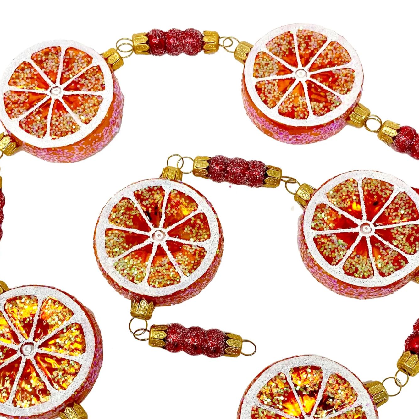 These glass blood orange slices are rich in color, saturated with sparkle, and dripping in drama. From the vivid ruby centers to the pink glitter crusts, every detail recalls a Sicilian sunset. Whether hung across a mantel or framing a holiday feast, this garland is pure fruit-forward glamour.