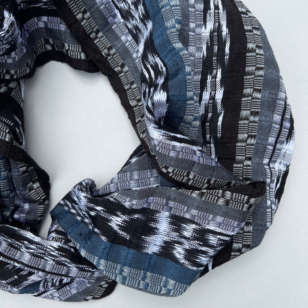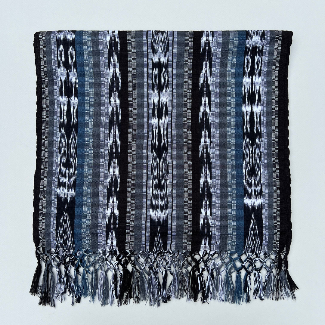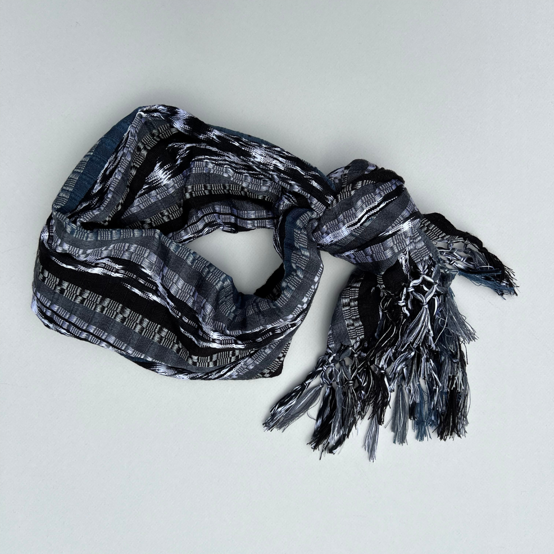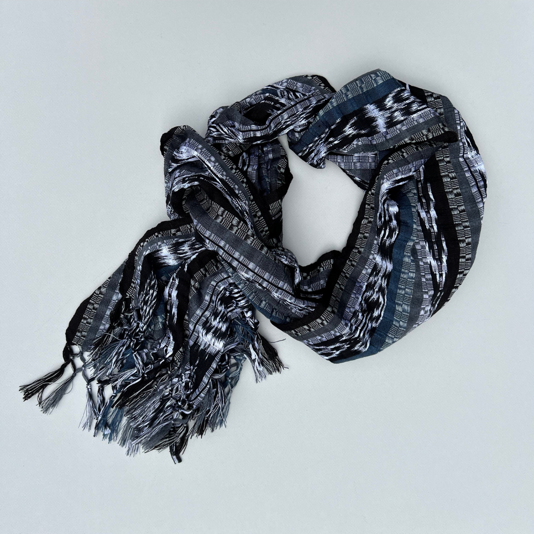 Step into fall with a pop of color with Intertwined's Blue-Grey Handwoven Scarf. Handcrafted by artisans in Guatemala, this unique scarf features bands of blue-grey, black and white. Add a touch of warmth to your wardrobe with this versatile accessory.