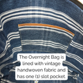 Vintage cotton exterior with slip pocket trolley sleeve. Fully lined with vintage cotton fabric. One interior slot pocket and one zippered pocket. Sustainably sourced, vegetable tanned leather.