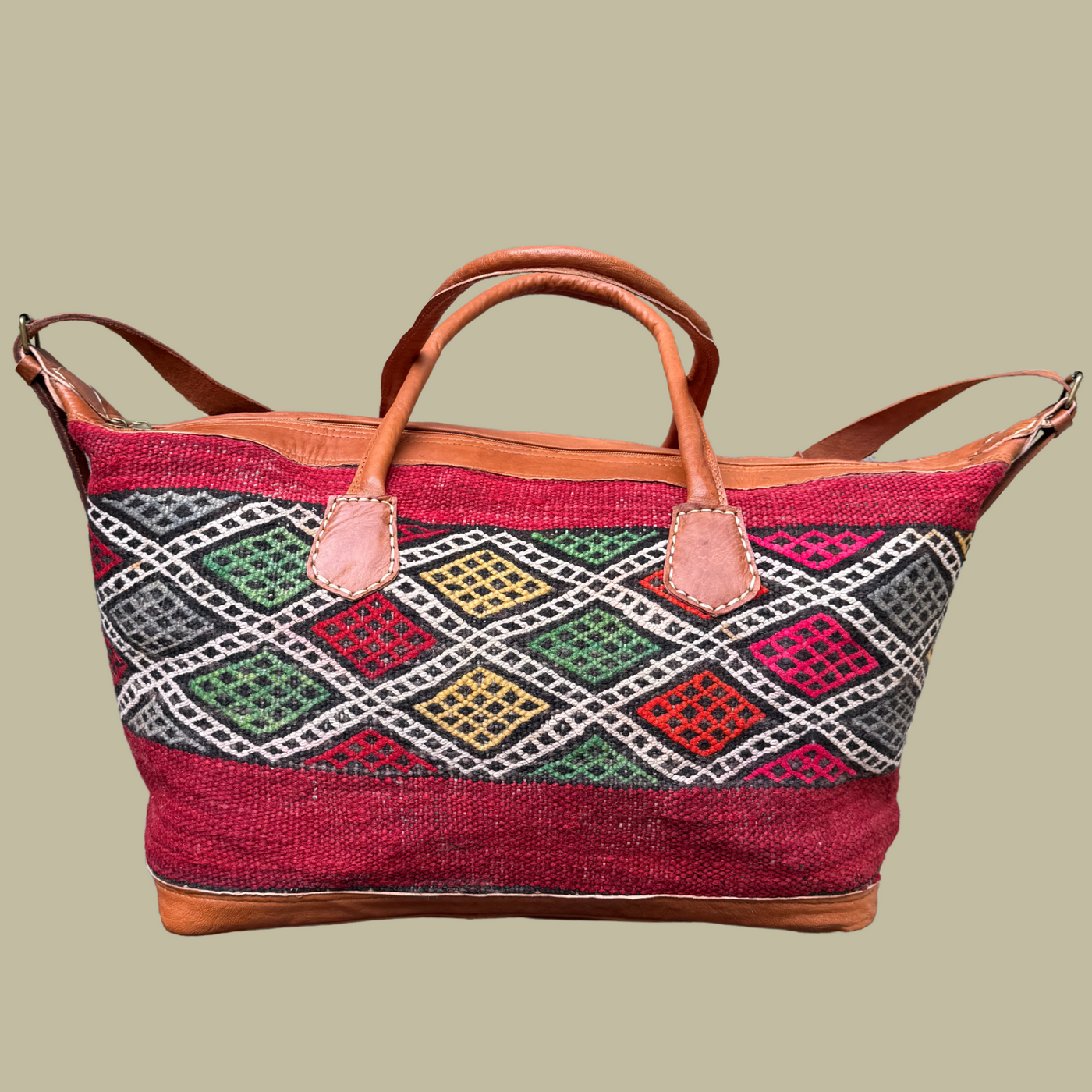 Handcrafted in Morocco by skilled artisans, this stylish and durable weekender bag features sustainably sourced, vegetable-tanned Moroccan leather paired with vibrant vintage kilim—each handwoven with distinctive patterns and colors that reflect the cultural heritage of its region. No two bags are the same, making yours truly unique.