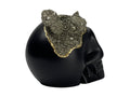 This unique and stunning piece of art is inspired by the belief in crystal power. This is a one-of-a-kind large concrete skull, skillfully hand-cast from high quality natural cement and adorned with natural Pyrite crystals. This is a realistic skull with an incredible geode on top.