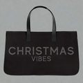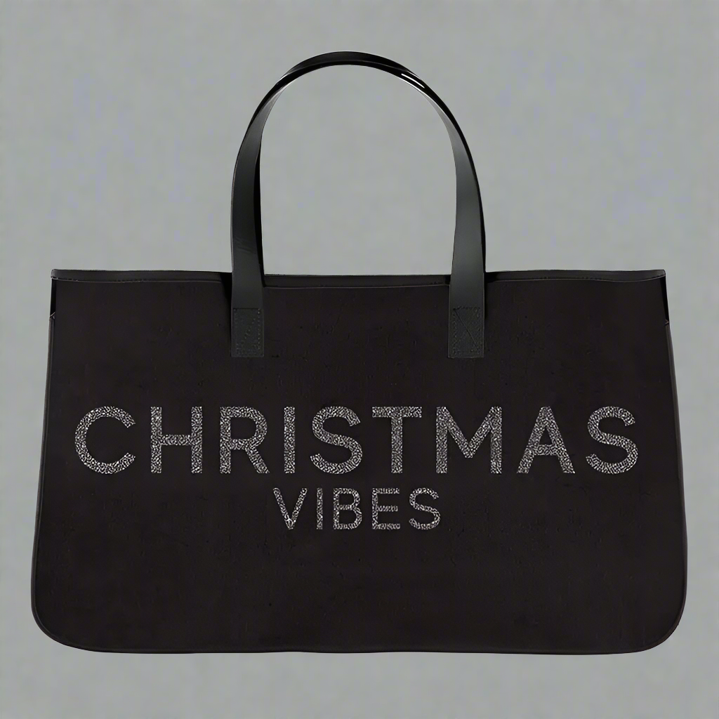 Modern black on black design with GLITTERED text! Genuine leather handles stitched to heavyweight canvas with an inside pocket for easy storage. Waterproof lining makes cleaning a breeze and protects against any accidental spills. The perfect bag to pack up Christmas gifts with or give to for anyone in your life!