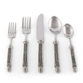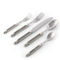 Artistically designed by Helen Richard, the handles of these pieces feature a delicate pattern inspired by traditional Provençal linens, lightly antiqued to show off the intricate details. This set, including a teaspoon, tablespoon, dinner knife, dinner fork and salad fork, is an ideal representation of function meeting style.
