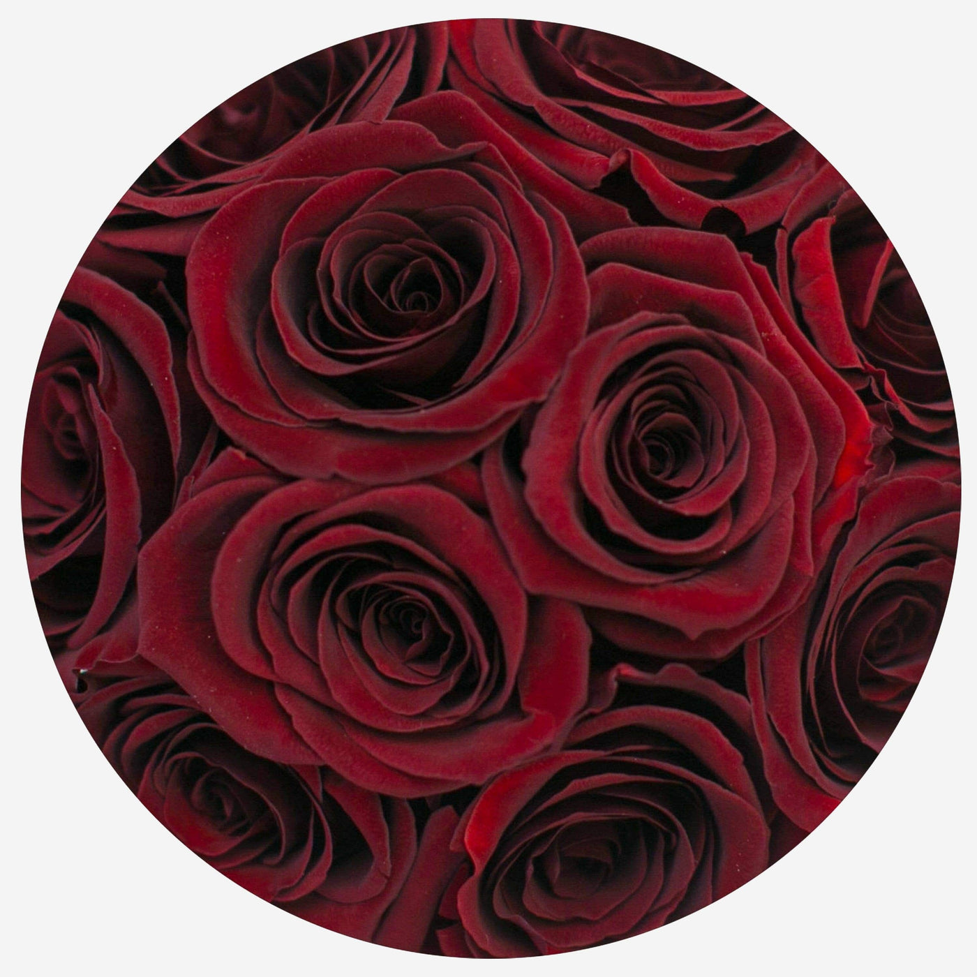 The hand-crafted white box in our signature basic arrangement showcases red preserved roses.
