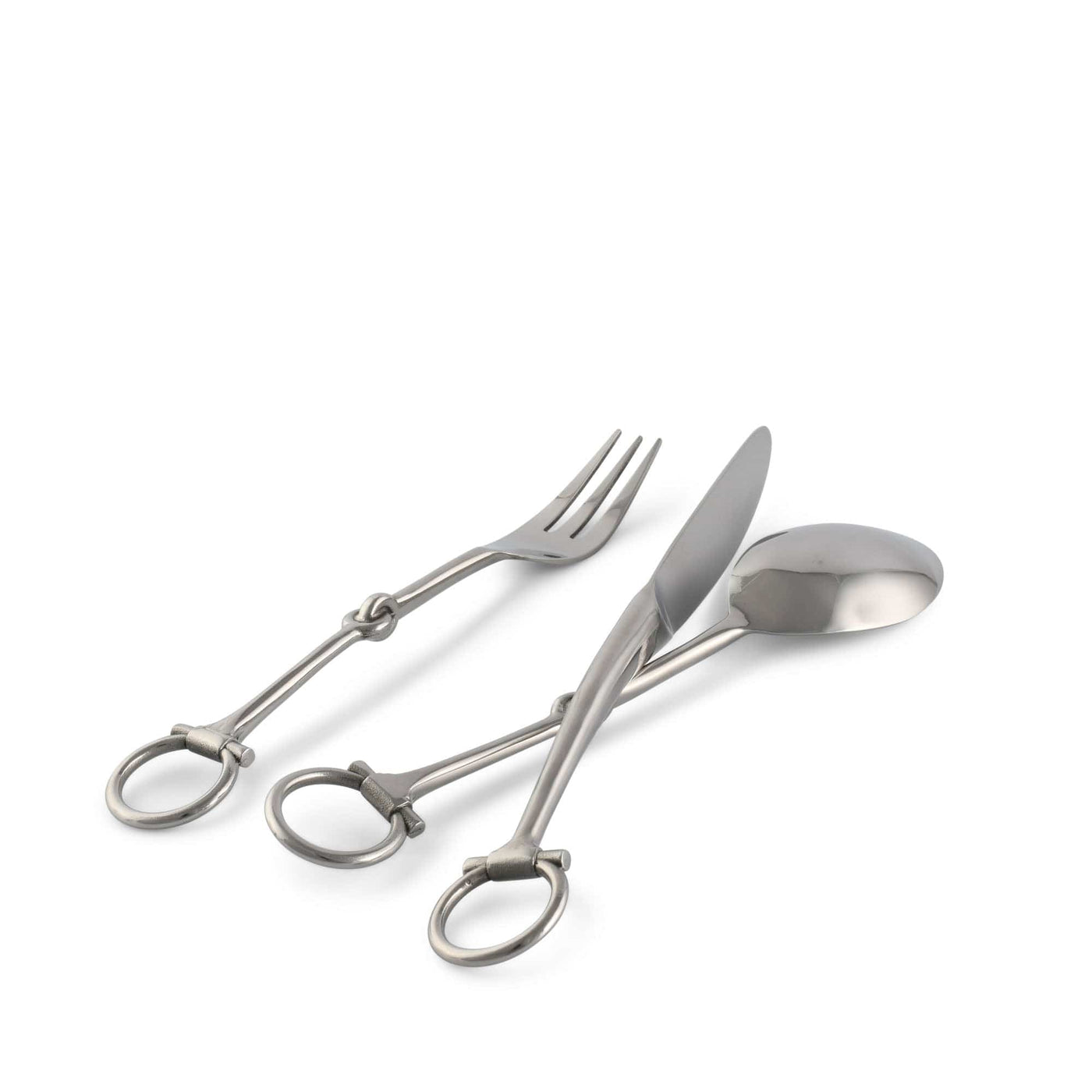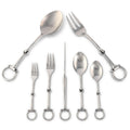 Indulge in elegance with the Matte Silver Horse Bit Flatware Set from the Equestrian Collection. Forged from stainless steel, this unique set showcases a distinctive horse-bit design and boasts a matte silver finish, underlining its sophisticated appeal. Its compact yet generous size, ideal for all dining occasions, offers an excellent balance between style and functionality. This dishwasher-safe set exemplifies craftsmanship, durability, and sprinkles a touch of equestrian passion onto your dining table.