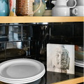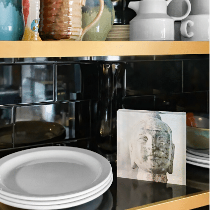 The clarity of the acrylic adds life to these art pieces and richness to their colors. The weight of the pieces means they can stand upright on a table or shelf, or be used as a paperweight. We love them on open kitchen shelving.