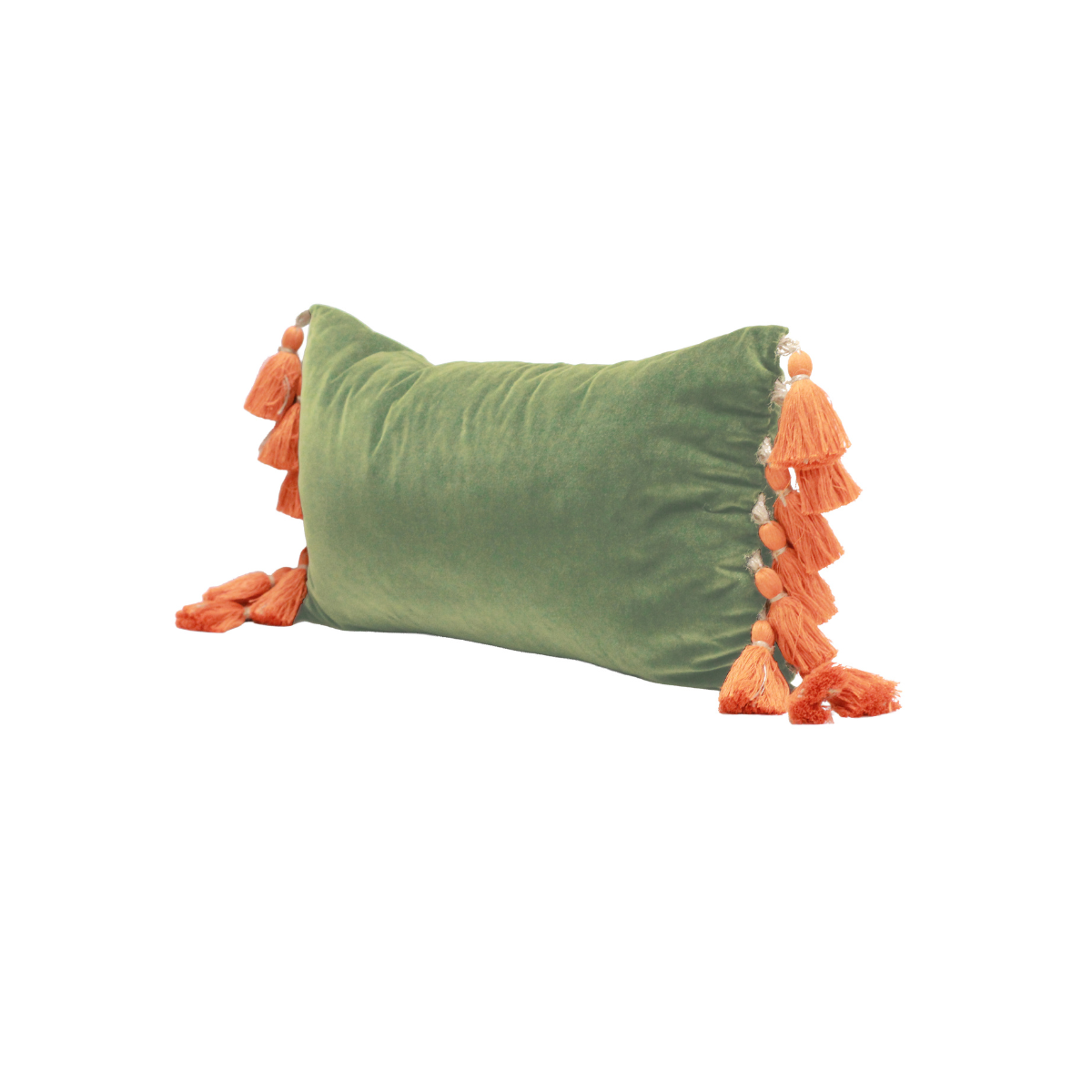 The unexpected color combination is equal parts fresh and bold. The earthy green velvet feels grounding and sophisticated, while the warm marmalade fringe delivers a playful, maximalist punch. The result? A mesmerizing accent that elevates a neutral sofa or layers beautifully into an exuberant mix of pattern and color.
