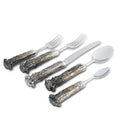 Dive into the world of rustic elegance with the Pewter Antler Flatware Set from our distinctive Western Frontier collection. Crafted from a unique blend of pewter and stainless steel, this set boasts realistically textured handles, inspired by antler's natural patterns, giving a distinct look to your dinnerware. With a length of 9.5 inches, it's perfectly sized for comfortably hosting your elaborate rustic-themed parties. Exemplifying the finer details of rustic pewter design, this set crowns Vagabond House's commitment towards quality and craftsmanship.