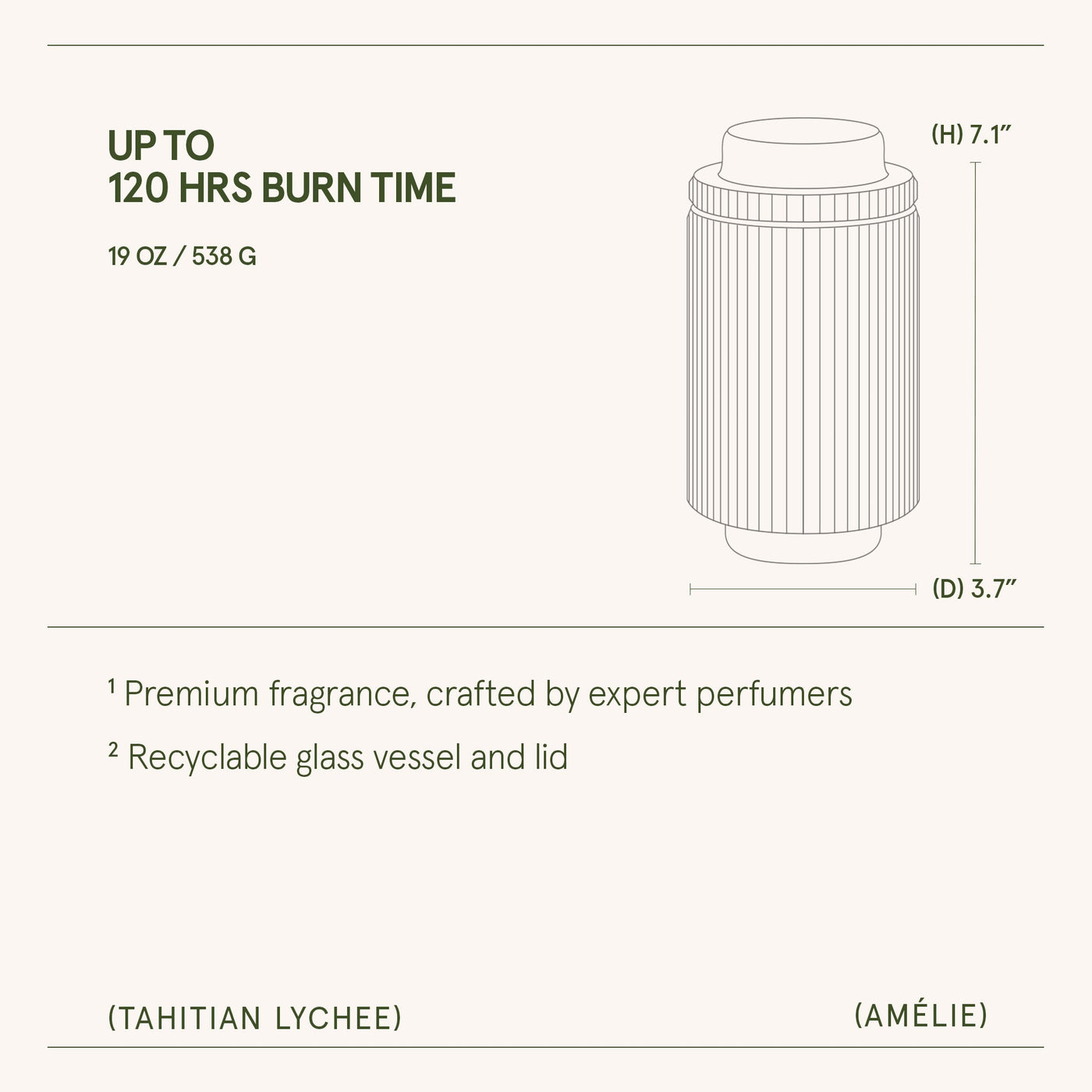 Bring the vibrancy of the tropics home with the Amélie Tahitian Lychee Candle. Bursting with juicy lychee and pineapple, softened by rose and musk, this fragrance inspires energy and joy in every moment.