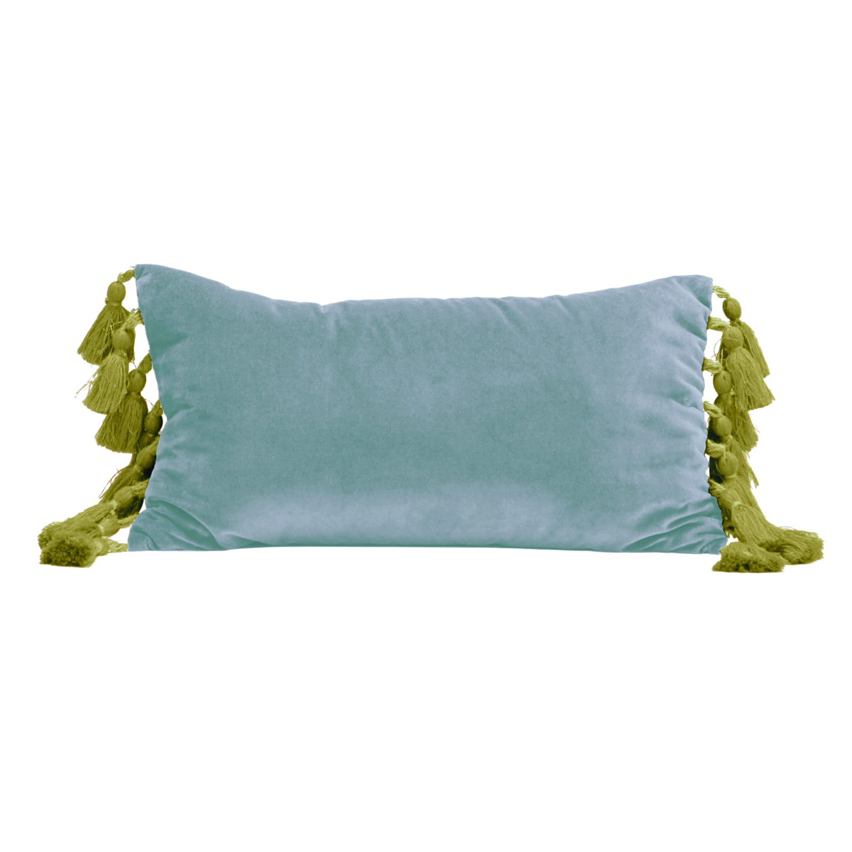Our Ritz pillow collection is high-style and statement-making and this Wedgwood edition is no exception. Hand sewn in sumptuous cotton velvet, this pillow features a blue hue paired with SmithHönig’s signature Verymore fringe trim in Matcha.