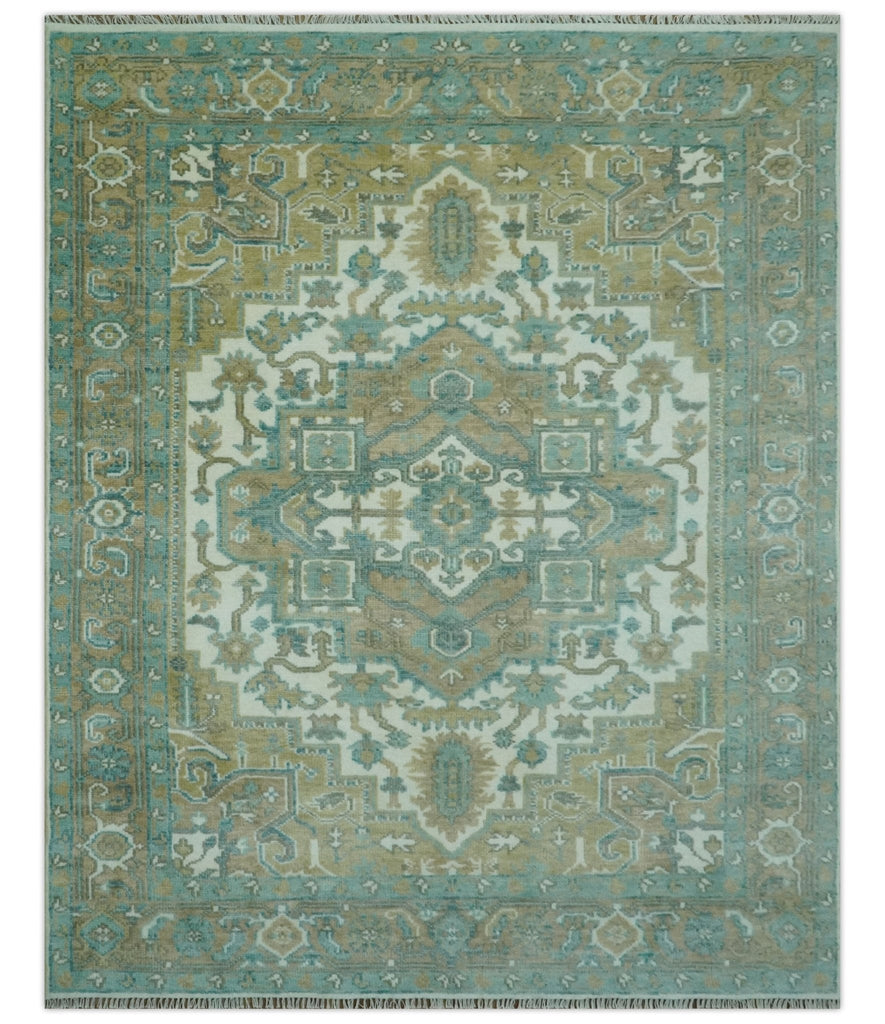 Ivory, Olive and Teal Hand Knotted Traditional Heriz 8x10 wool area rug