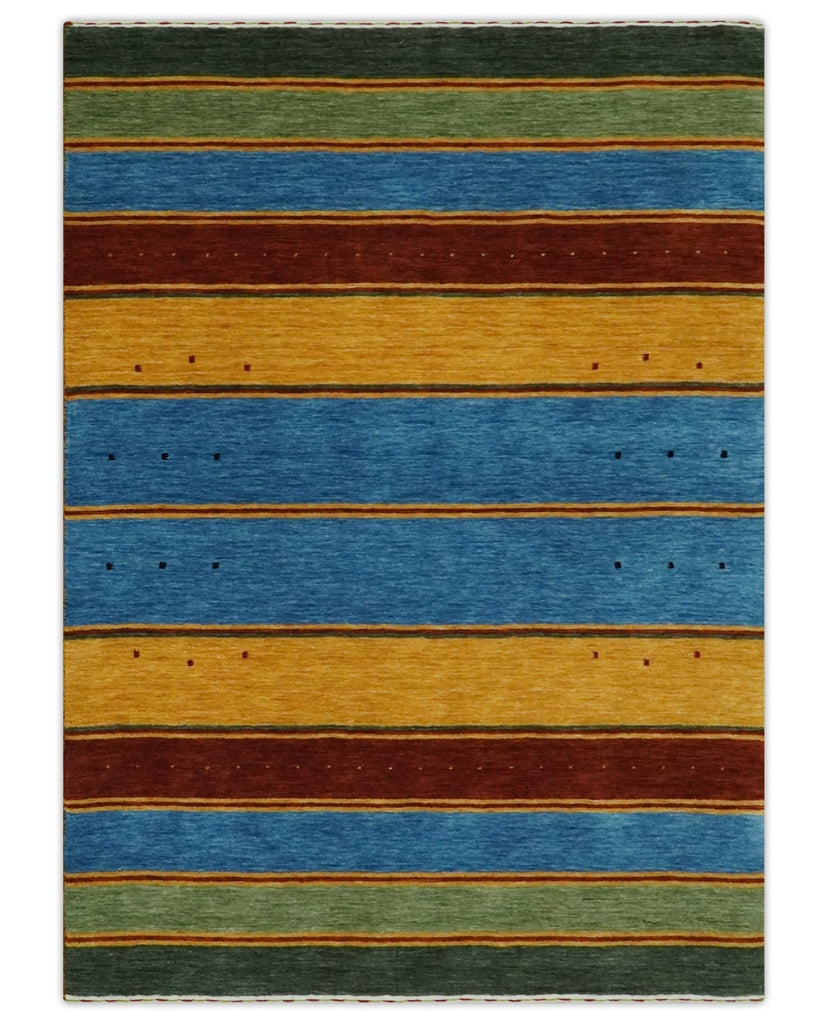 Modern Geometrical Blue, Gold, Brown and Green Stripes Design Hand loom 4.6x7 wool Area Rug