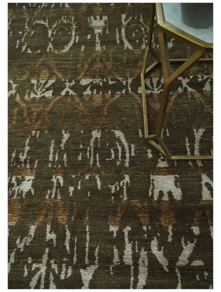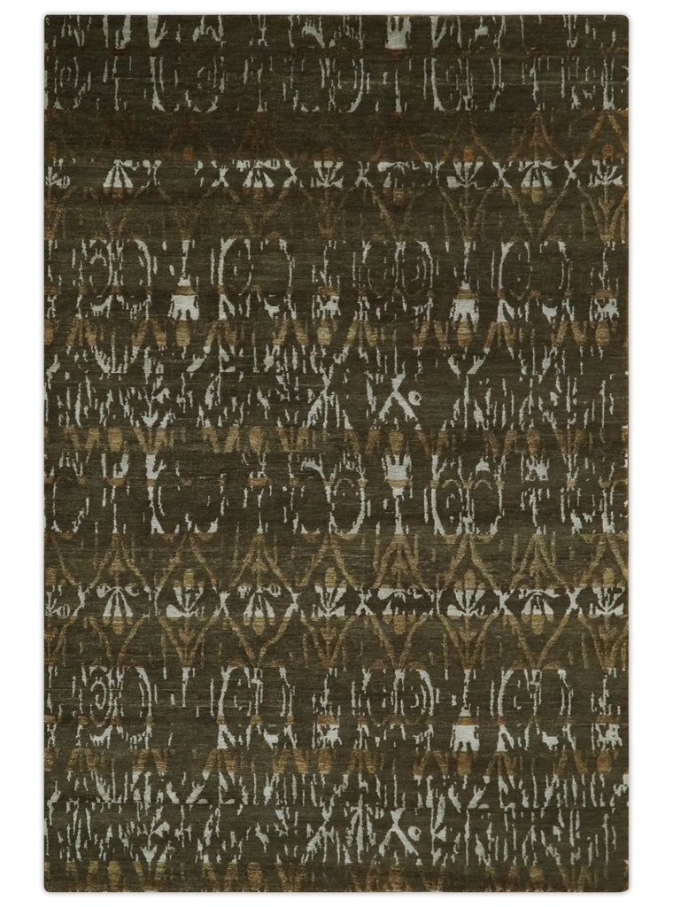 Olive, Ivory and Brown Hand Knotted Traditional Ikat Design 6x9 wool and Viscose area Rug