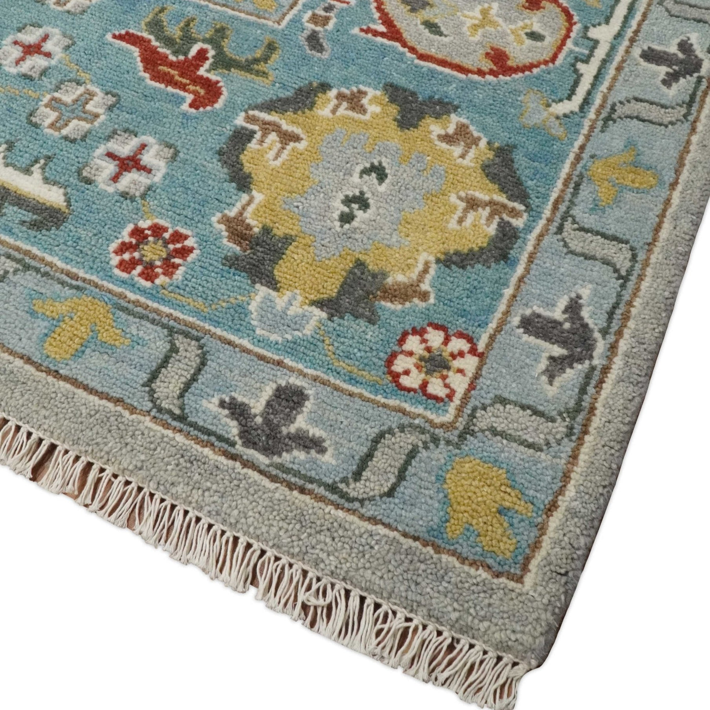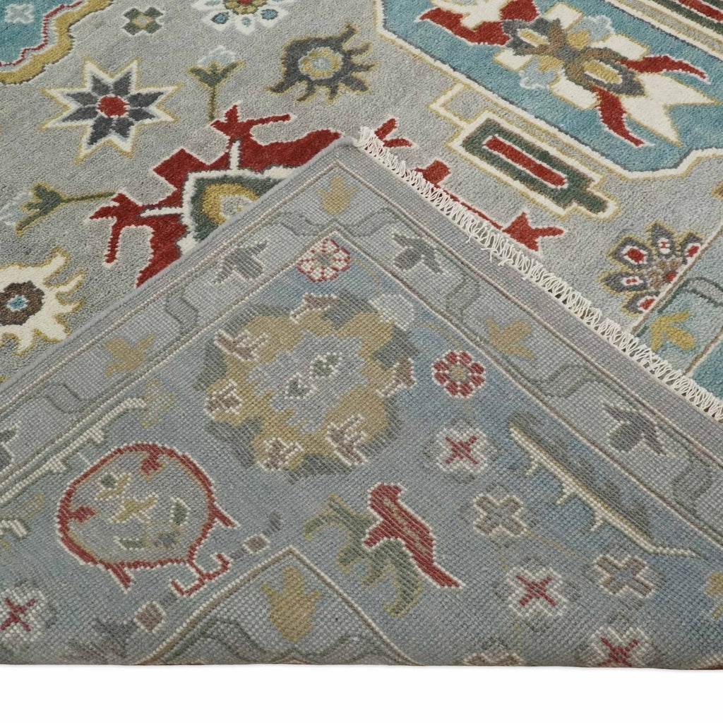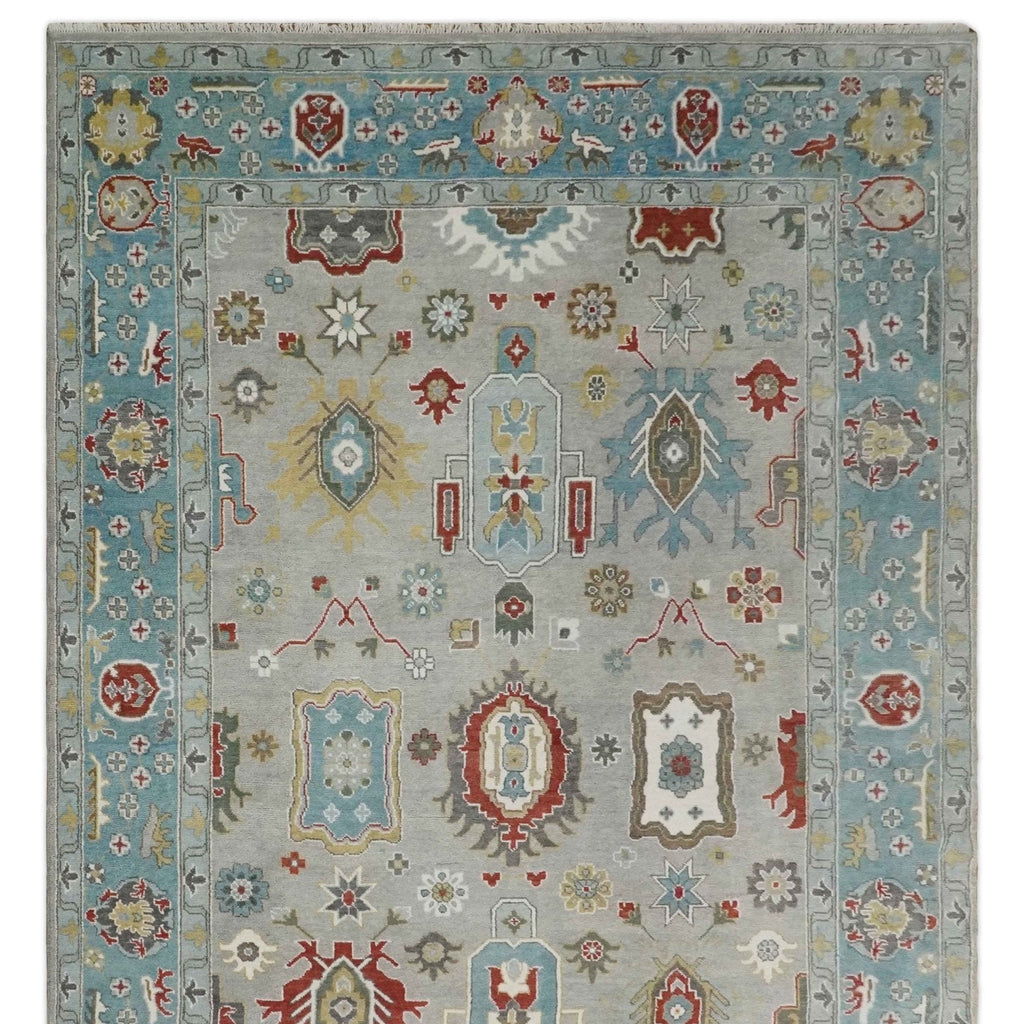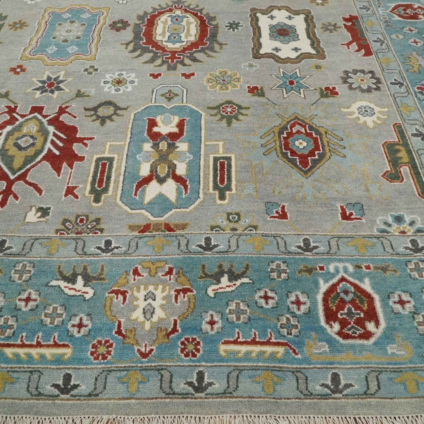 - 10x14 All Wool Traditional Silver and Blue Vibrant Colorful Hand knotted Oushak Area Rug