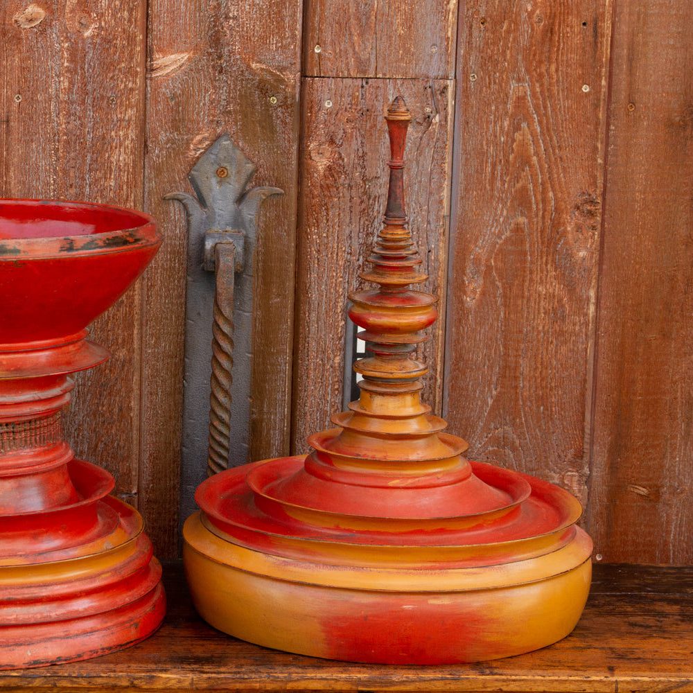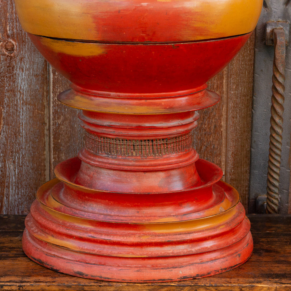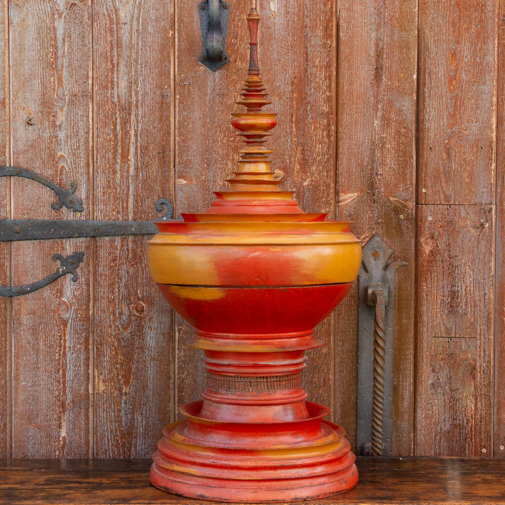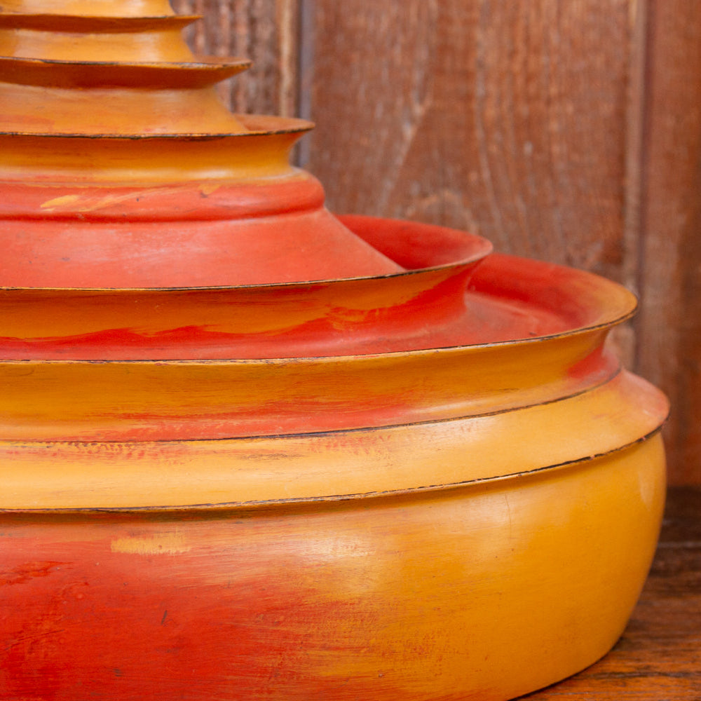 Lustrous Burmese temple food offering vessel with its original lacquer finish in a red and yellow color and multiple components. It was made in the Shan style with a stupa or temple shape with a wide base and and final top.