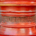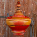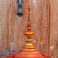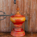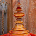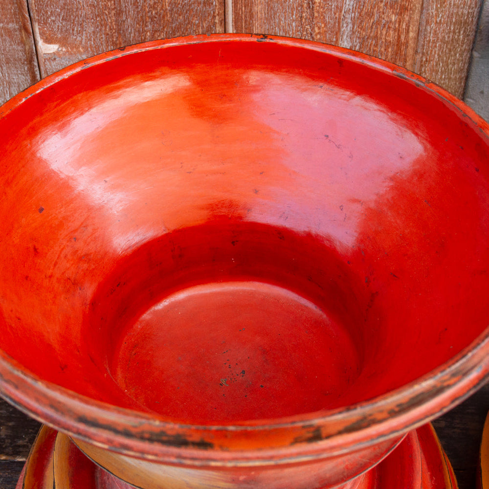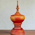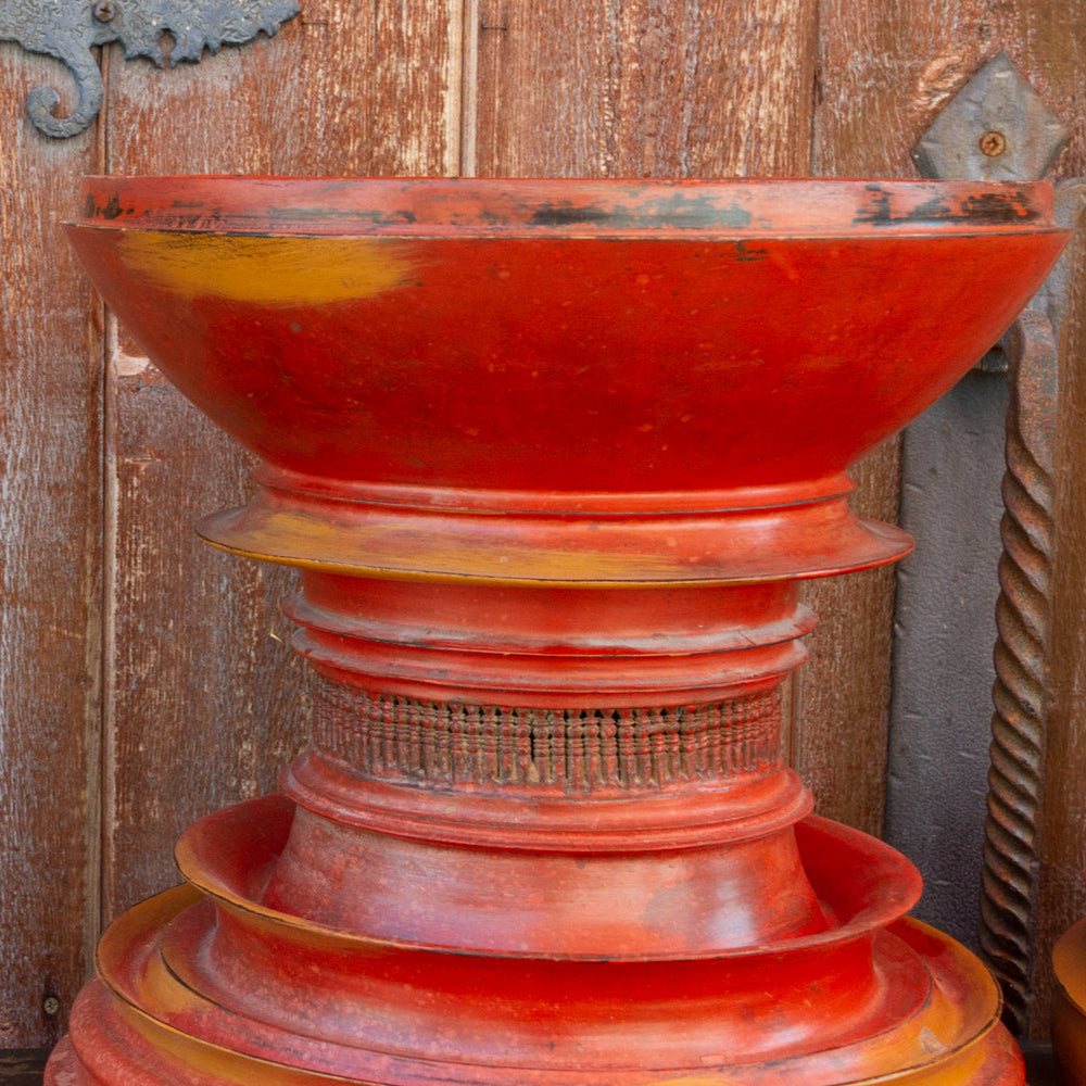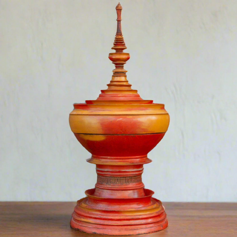 Lustrous Burmese temple food offering vessel with its original lacquer finish in a red and yellow color and multiple components. It was made in the Shan style with a stupa or temple shape with a wide base and and final top.
