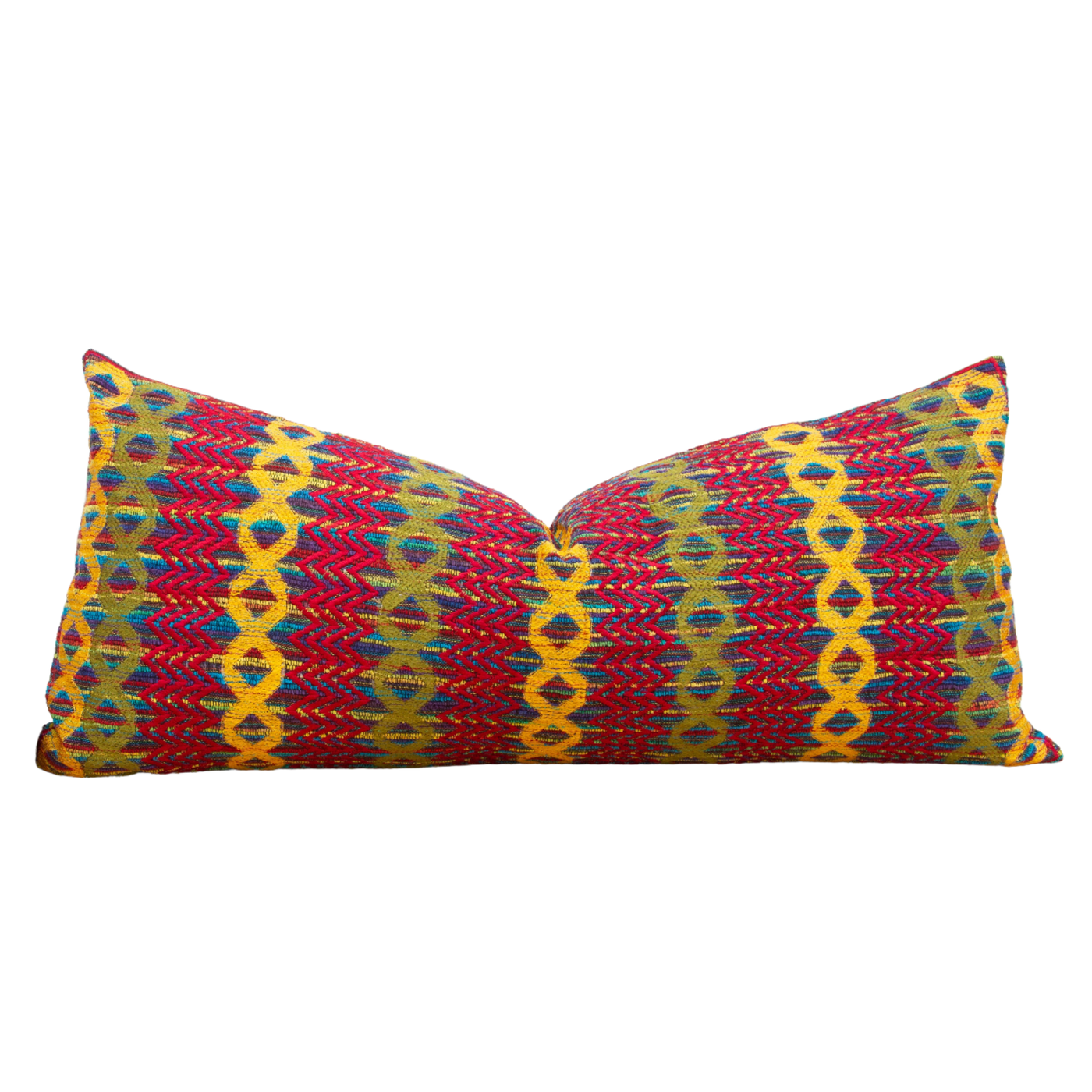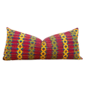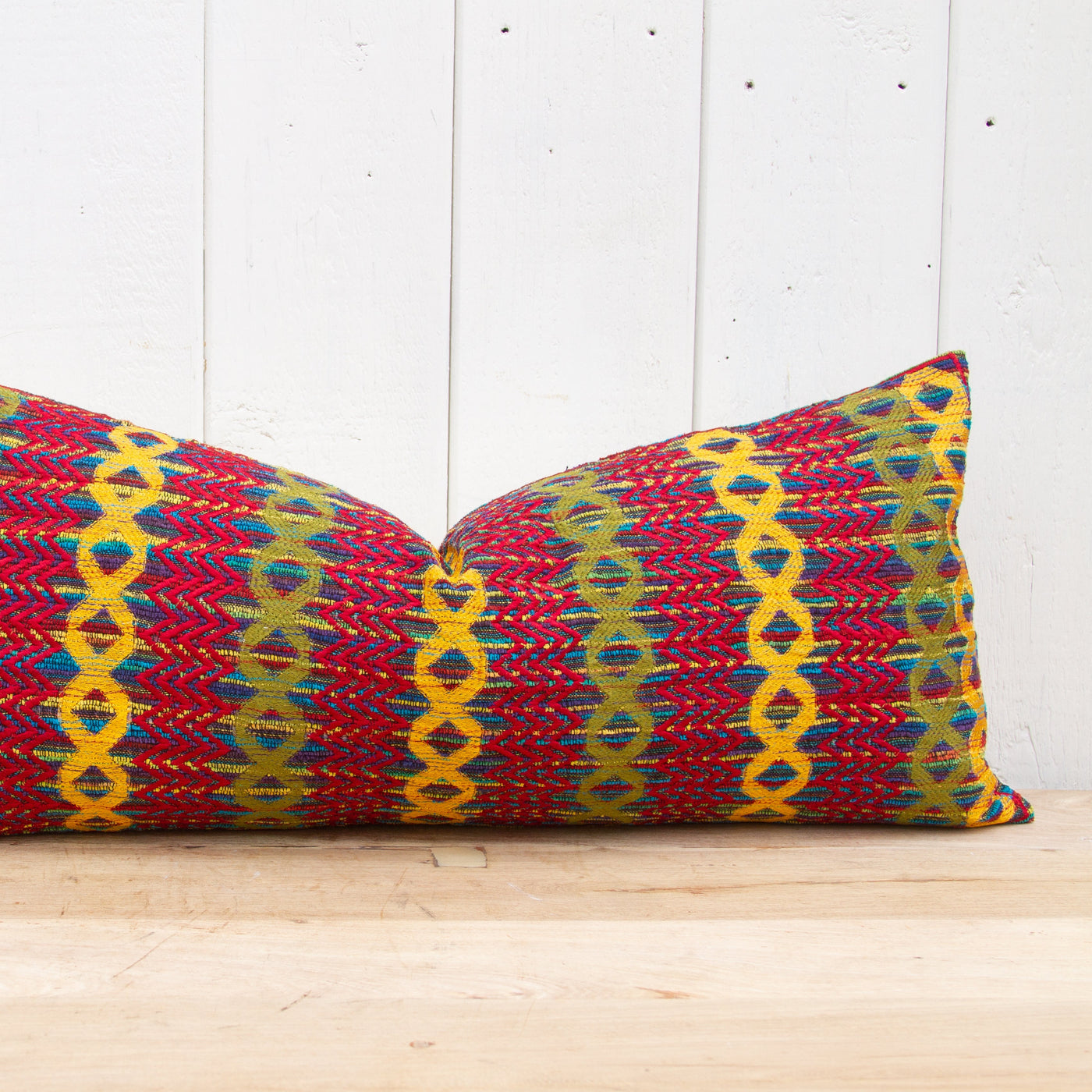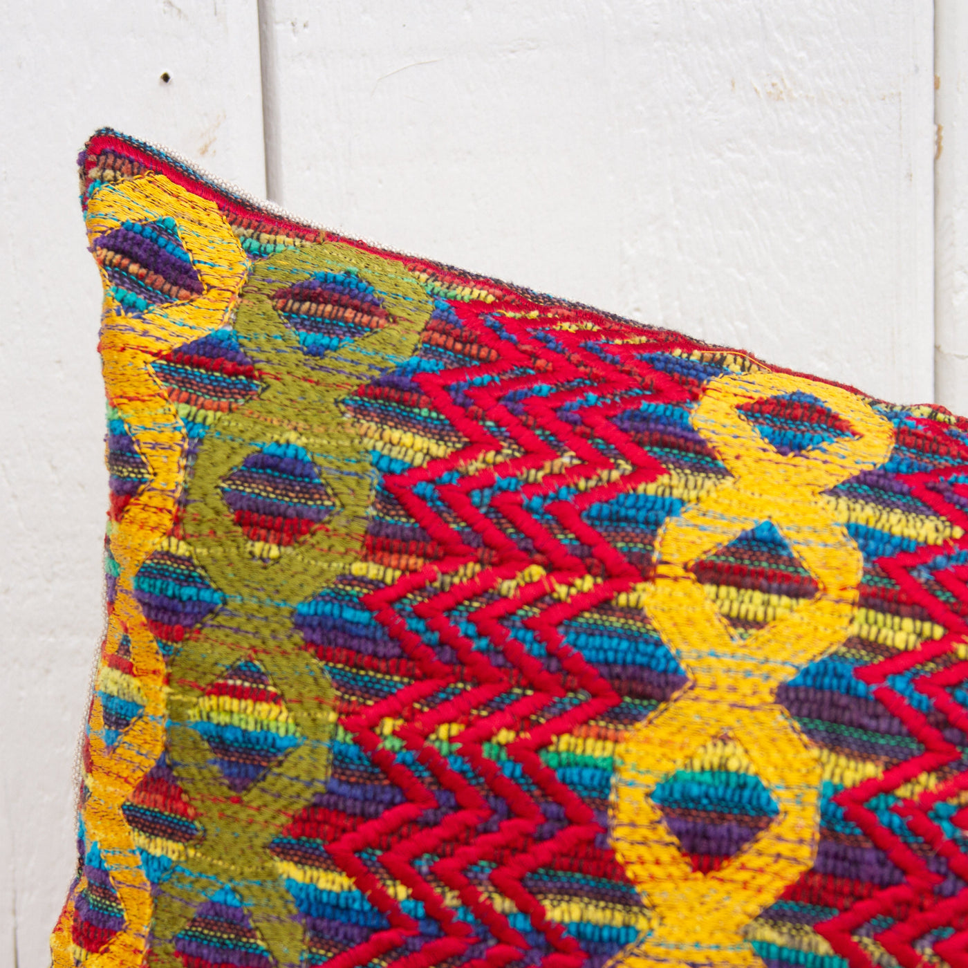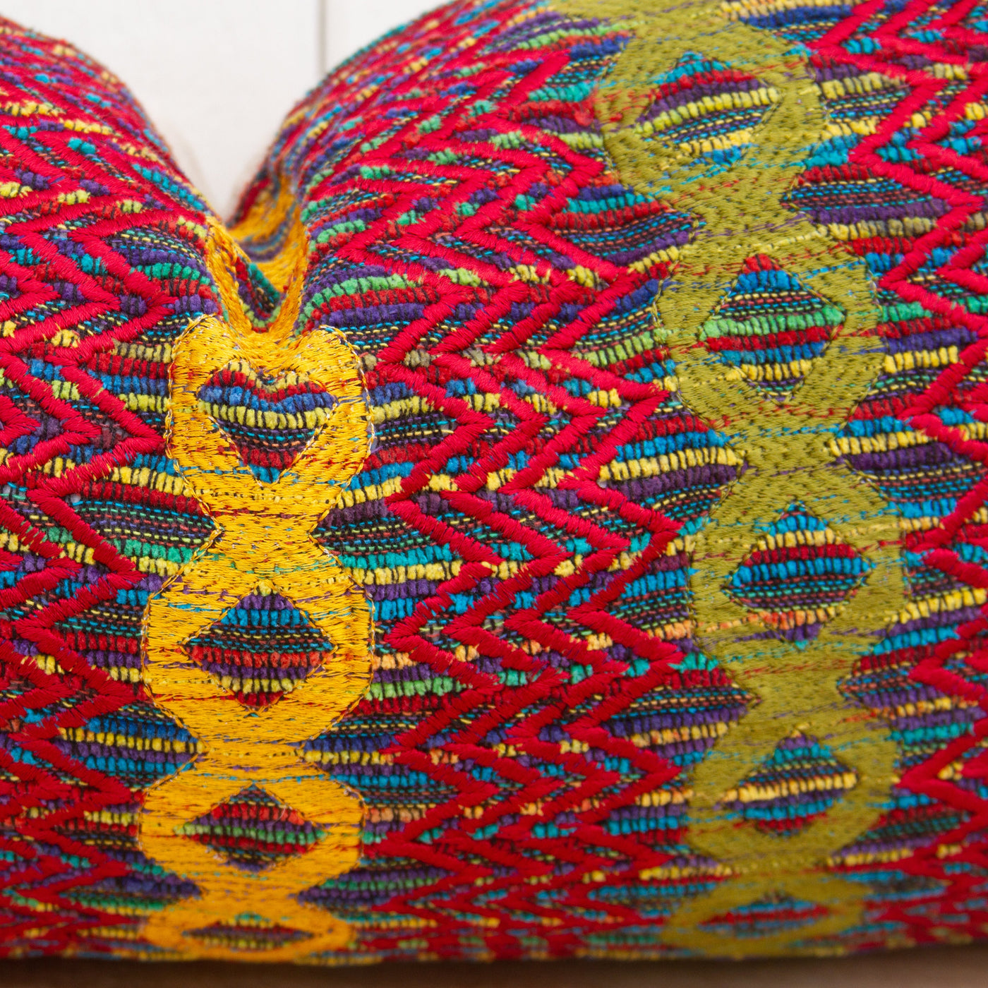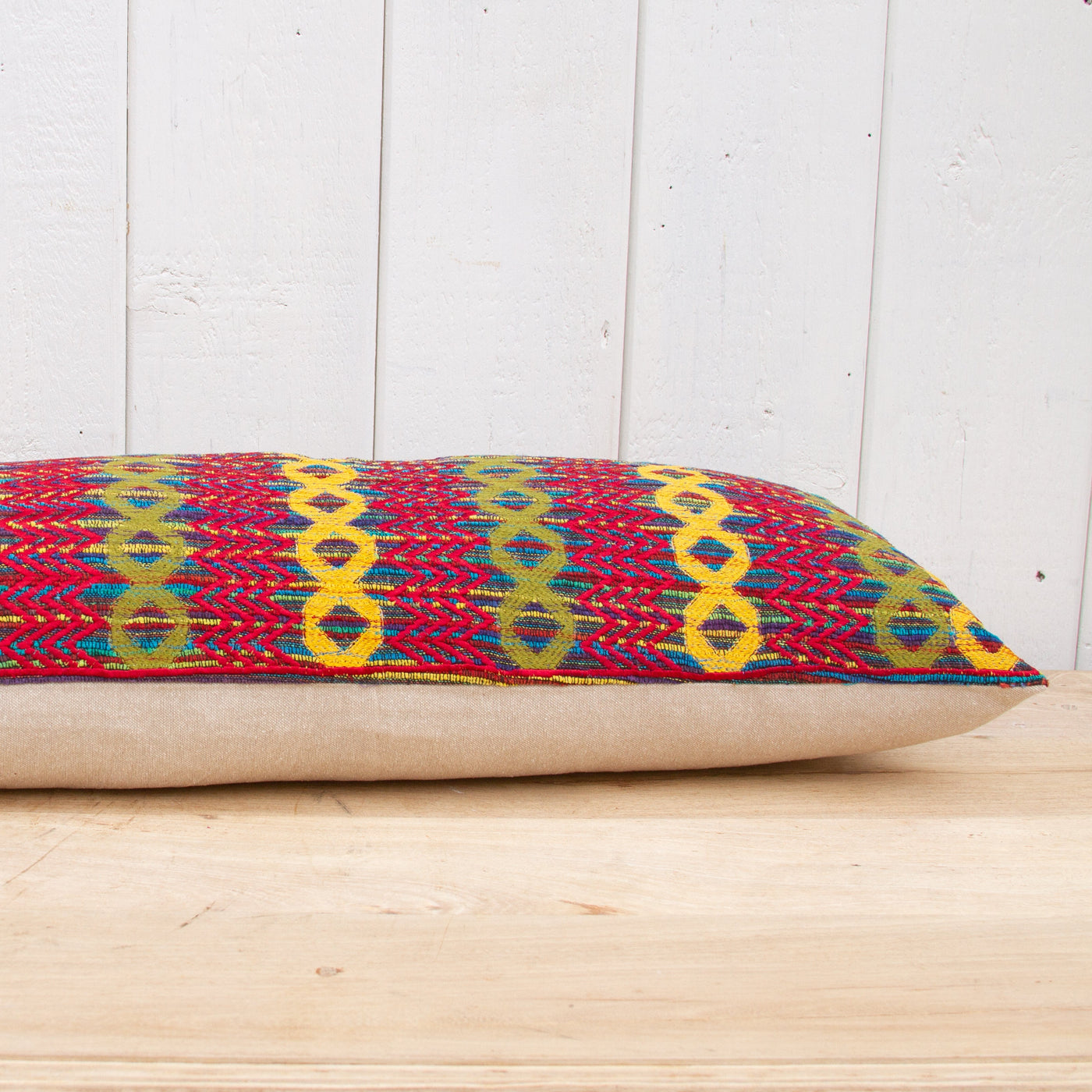 This Swati tribal pillow was created using intricately embroidered fabric from Swat Valley, where "phulkari" embroidery was its classic symbol. With bold silken hues and elaborately scrolled motifs, these pillows also have a linen back and a zipper enclosure, insert not included.