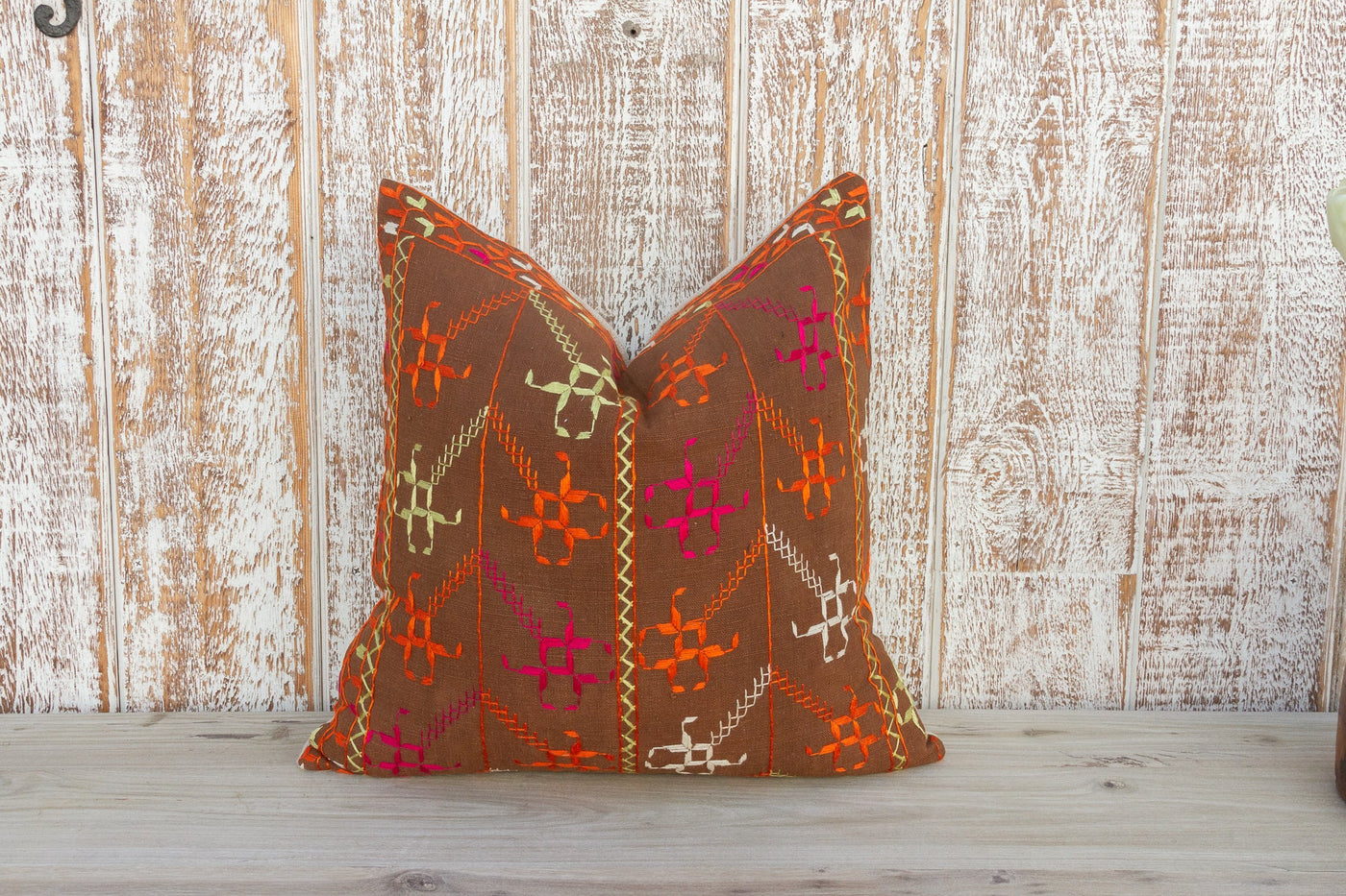 This colorful and luxurious Bagh Phulkari pillow features beautiful hand-done silk embroidery on top of a cotton fabric. Phulkari means "flower work" and is very descriptive of this vibrant, delicate pillow. Phulkari fabrics are often used in ceremonies concerning birth and marriage. Has a hidden zipper closure, pillow insert not included.
