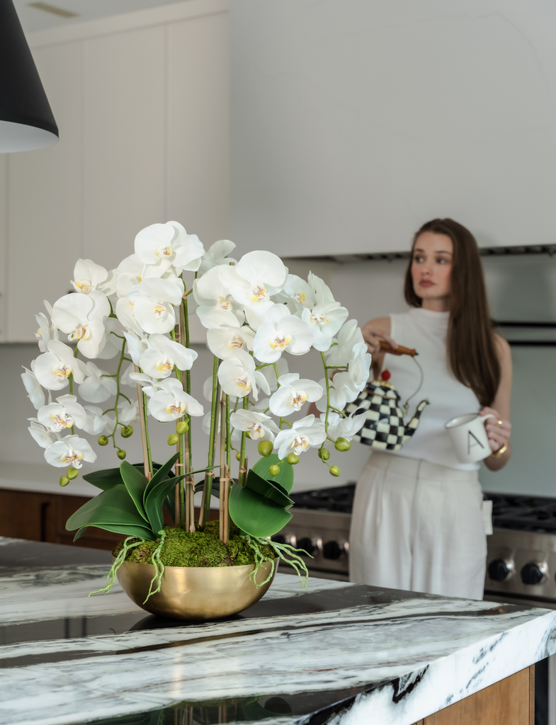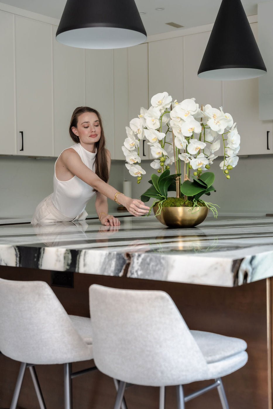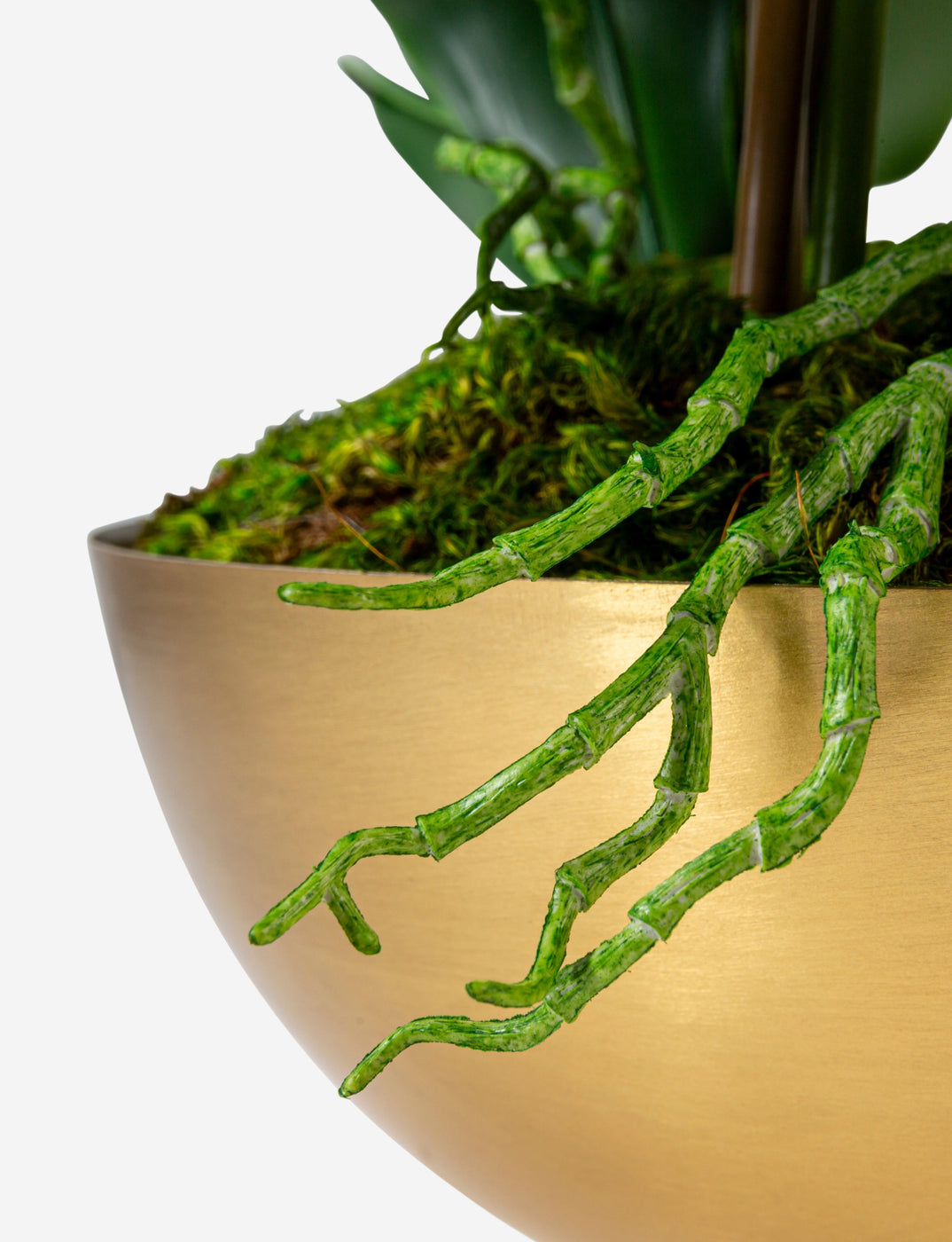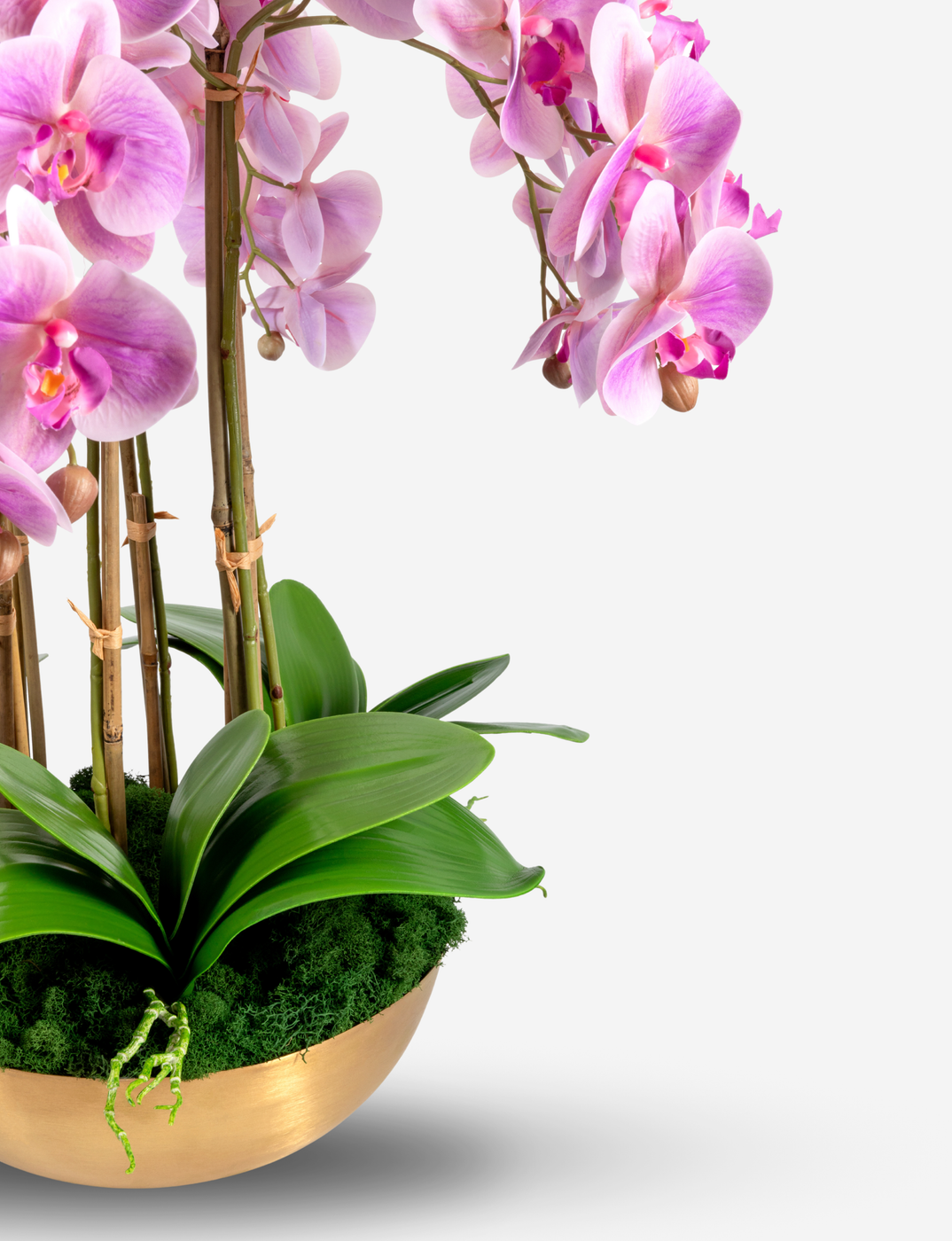 The Abigail Gold RealTouch Orchid Arrangement showcases six exquisite RealTouch Orchids, complemented by twelve elegant Orchid Leaves and Bamboo Sticks, all artfully arranged in a luxurious gold bowl. A true statement piece, it exudes refinement and sophistication, making it the perfect addition to elevate any space with unparalleled beauty. A lasting luxury, timeless and unrivaled.