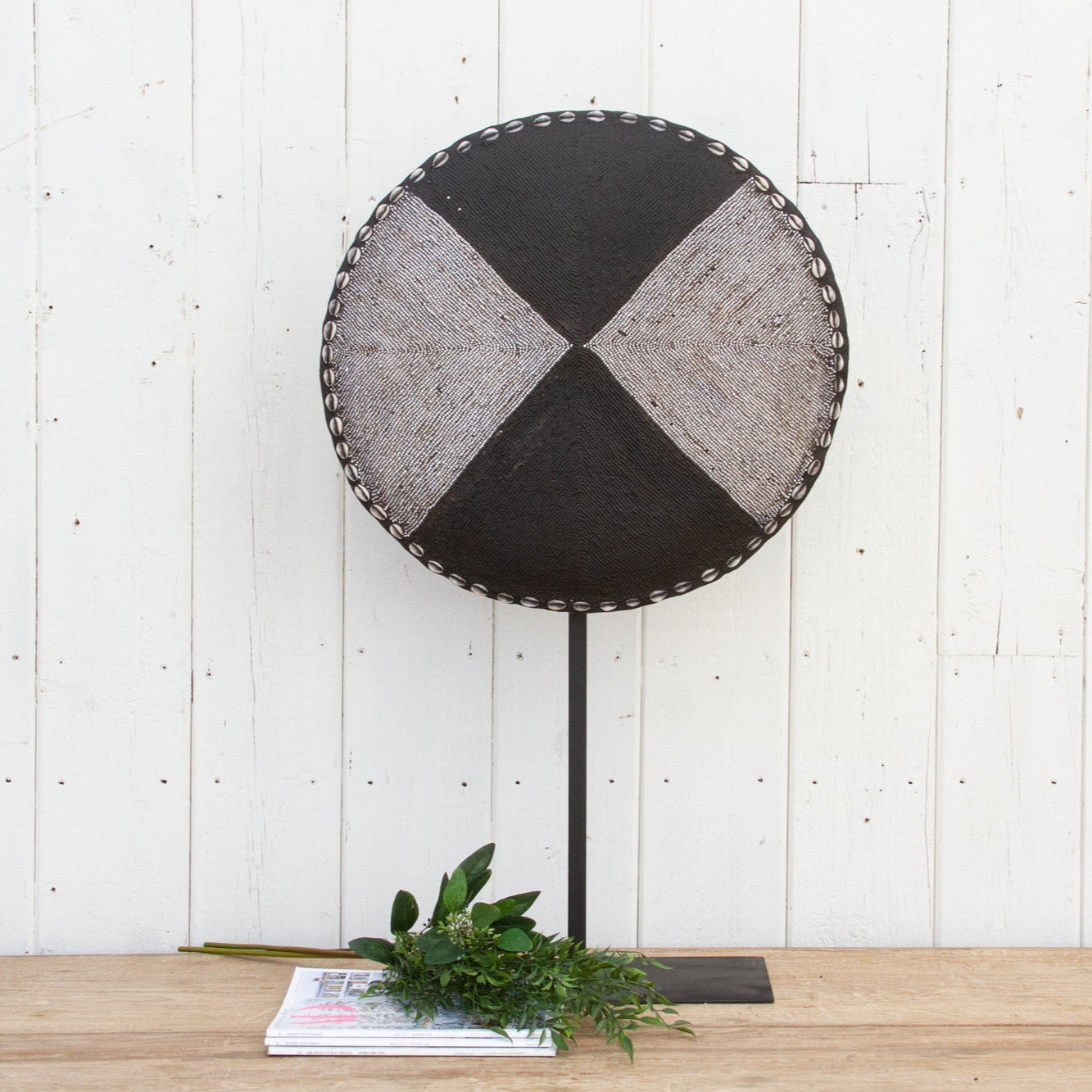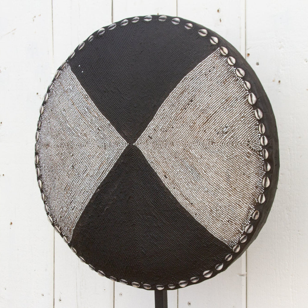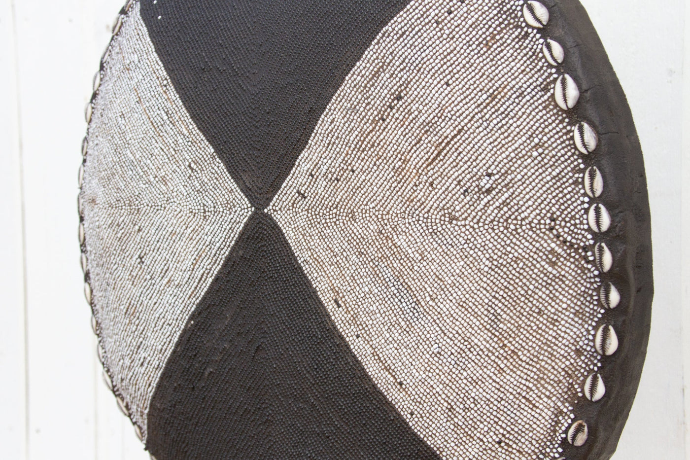 Beautiful African tribal round shield, meticulously hand-crafted from native hardwood and adorned with intricate beadwork using miniature glass beads. The wood African shield has a black and white beaded design a featuring a geometric design. Originally used in ceremonies, these shields symbolize family protection against negative energy. This shield has been thoughtfully mounted on a custom-designed stand, making it unique art piece.