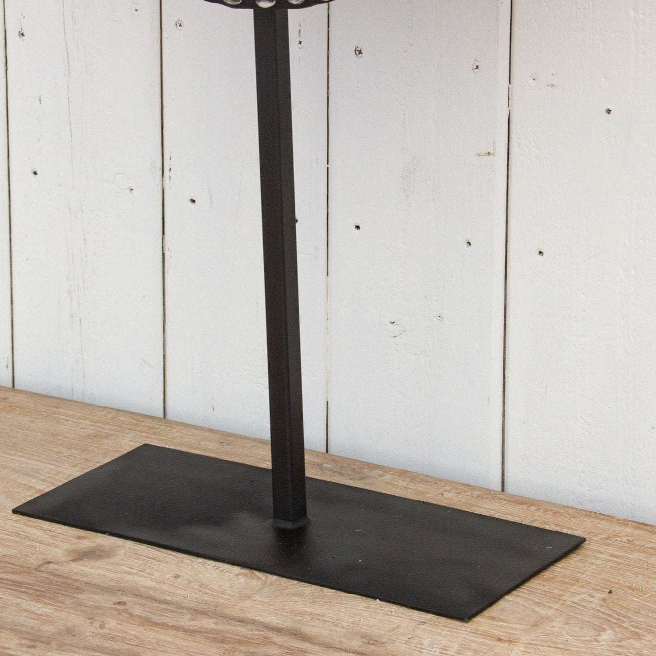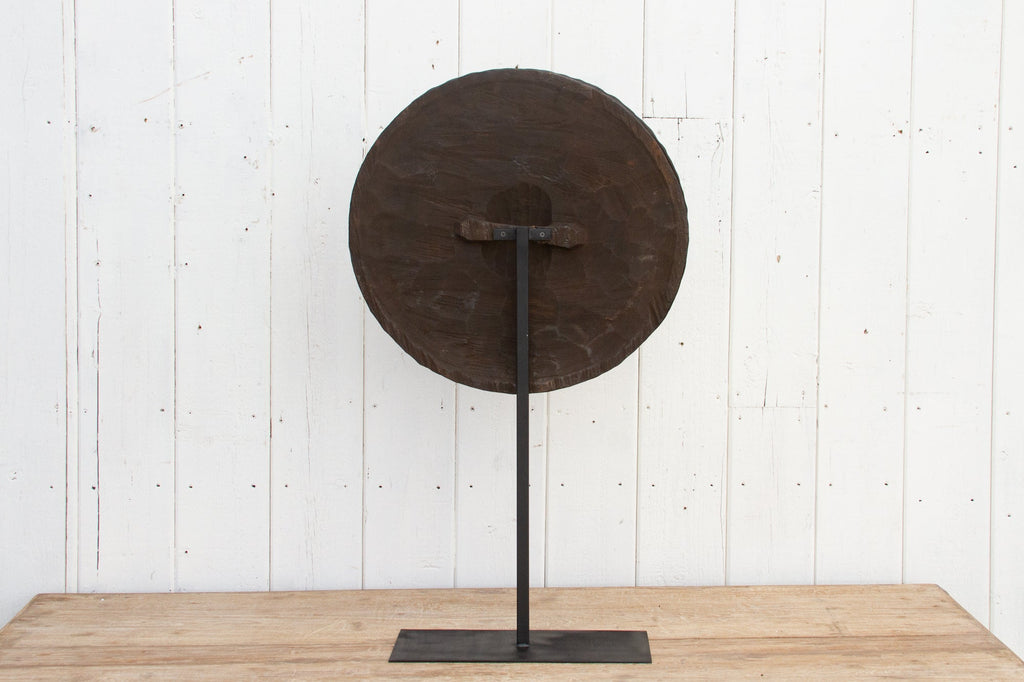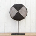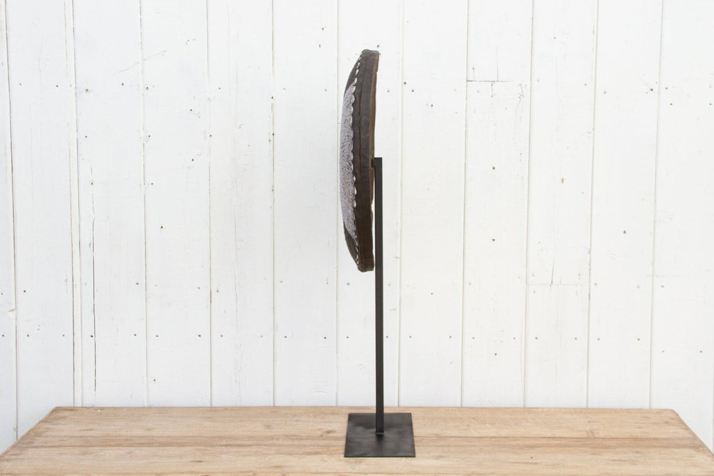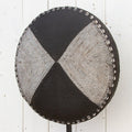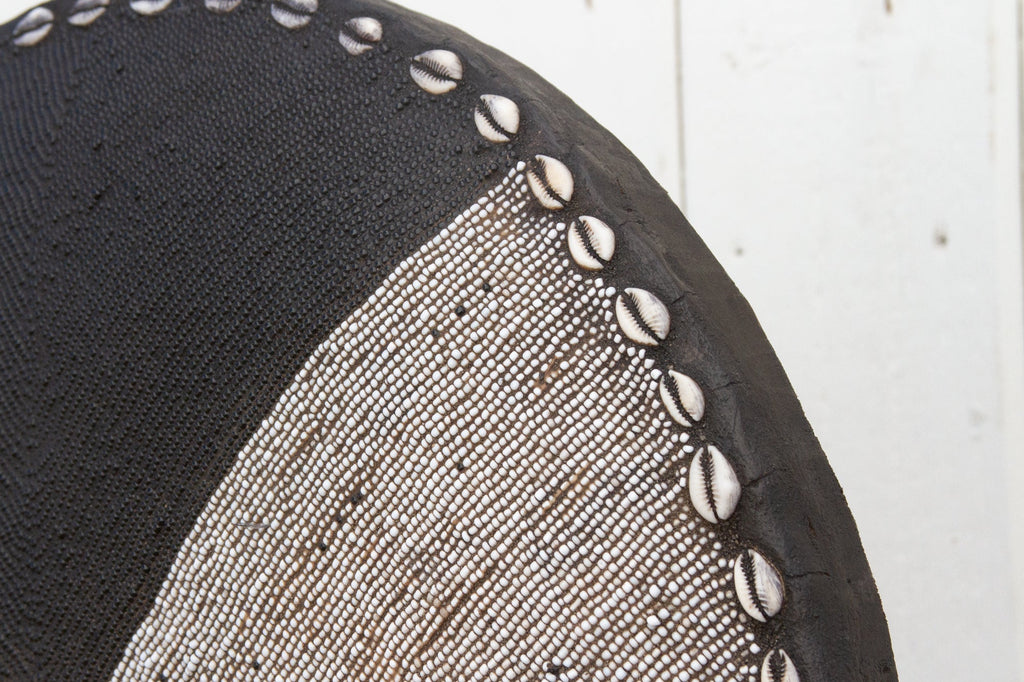 Beautiful African tribal round shield, meticulously hand-crafted from native hardwood and adorned with intricate beadwork using miniature glass beads. The wood African shield has a black and white beaded design a featuring a geometric design. Originally used in ceremonies, these shields symbolize family protection against negative energy. This shield has been thoughtfully mounted on a custom-designed stand, making it unique art piece.