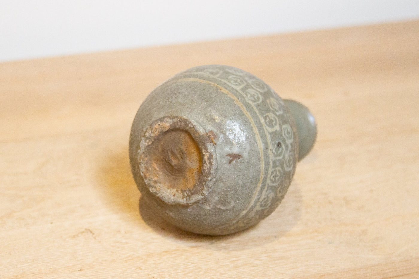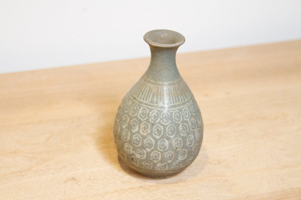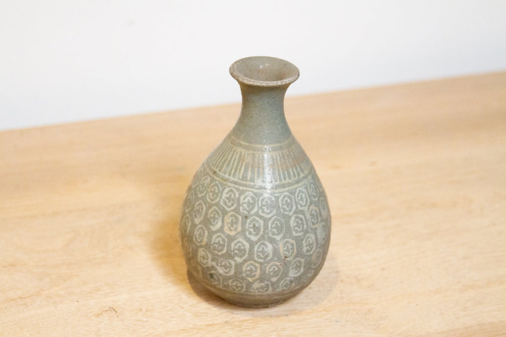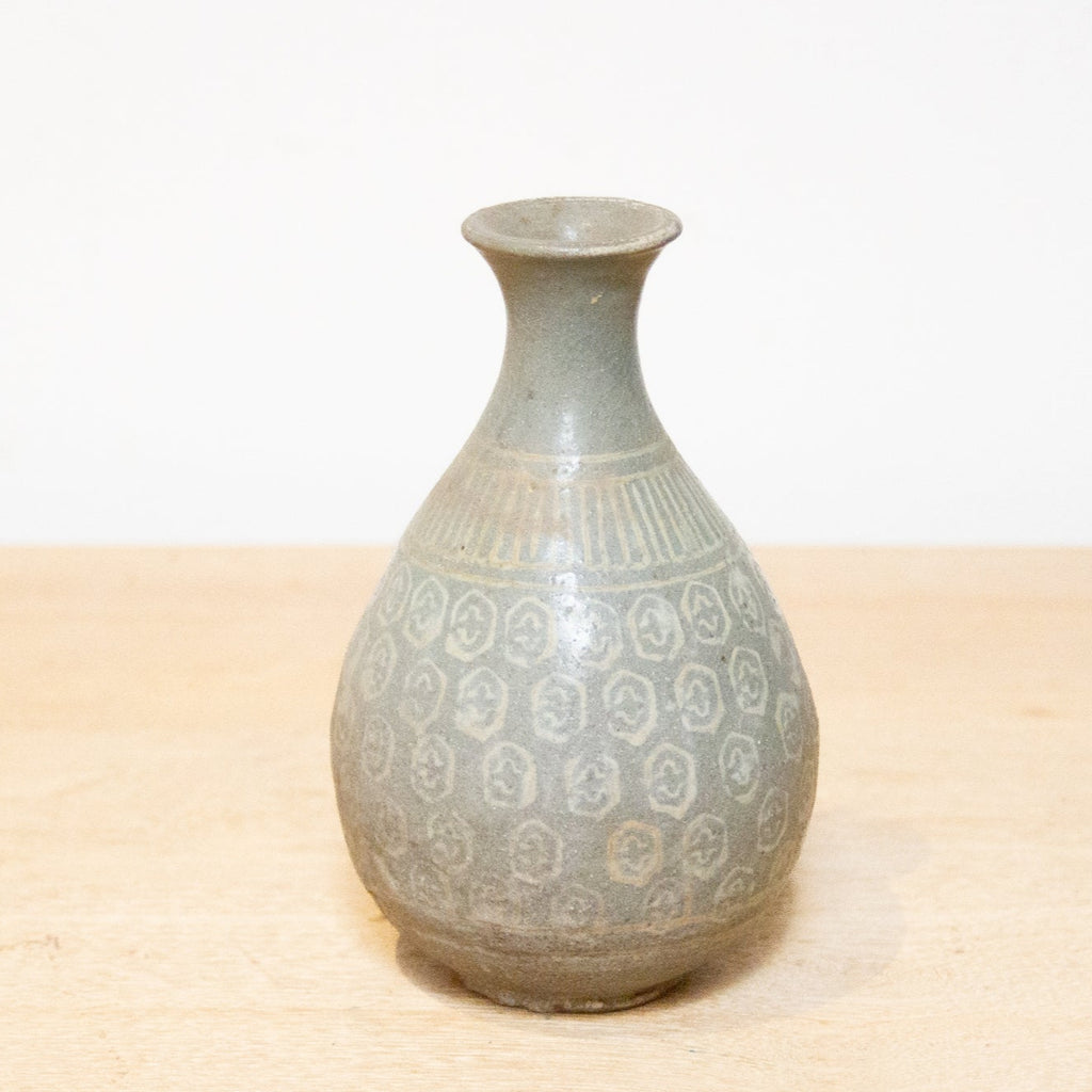 Korean inlaid celadon glazed vase, a testament to the artistry of Korean ceramics. The body adorned with repeating geometric figures between borders at the neck and foot showcases the meticulous craftsmanship of this antique decorative vessel. Originally, such vases were crafted for both functional and aesthetic purposes. In the past, they were used to hold and display flowers or other precious items, often gracing the homes of esteemed individuals. The delicate inlaid patterns and celadon glaze speak to the sophistication of traditional Korean pottery.