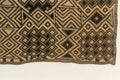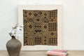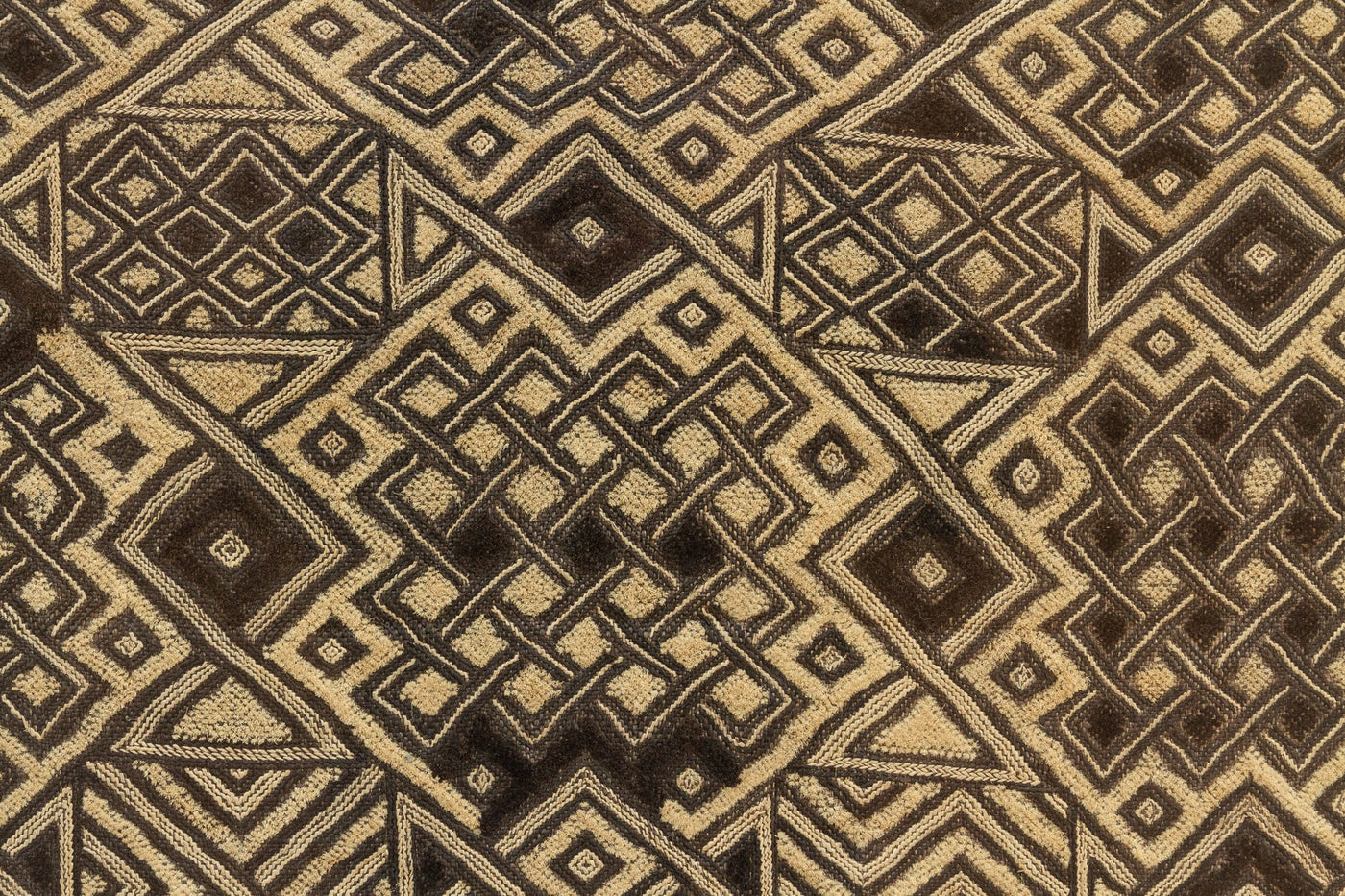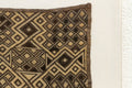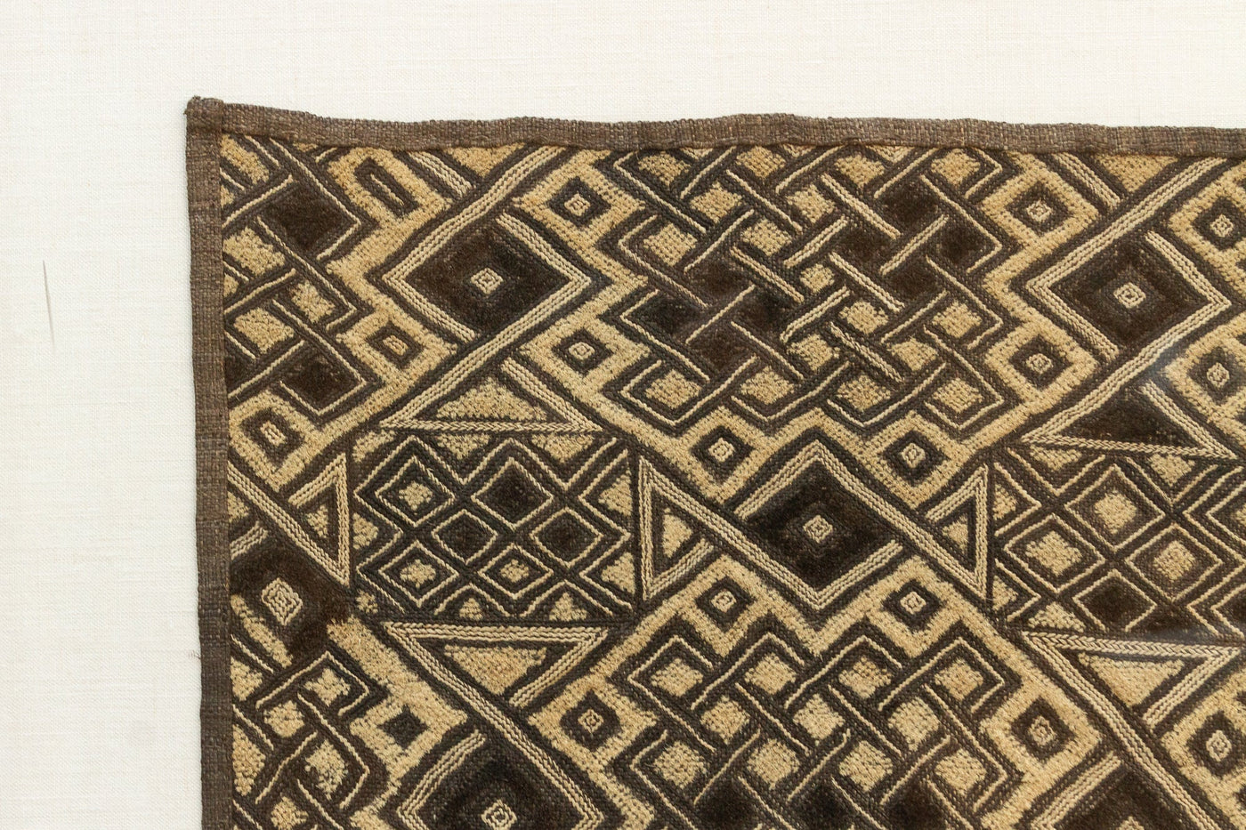 This striking textile panel showcases the artistry of the Kuba people, an ethnic group renowned for their raffia weaving traditions in the Democratic Republic of Congo. Kuba cloths, highly valued for their intricate geometric patterns and rich symbolism, served both practical and ceremonial purposes within Kuba society. This particular piece features a mesmerizing arrangement of interlocking diamonds and squares, created through a complex process of weaving, embroidery, and appliqué. The natural earth tones of the raffia fibers create a warm and inviting aesthetic, while the subtle variations in texture and pattern add depth and complexity. This textile, possibly used as a prestige garment, ceremonial cloth, or wall hanging, has been carefully framed with protective plexiglass to preserve its beauty and cultural significance. It's a captivating piece for collectors of African art, textile enthusiasts, and anyone who appreciates the artistry and heritage embedded in traditional crafts. Shows wear on artwork, age marks and blemishes on frame.