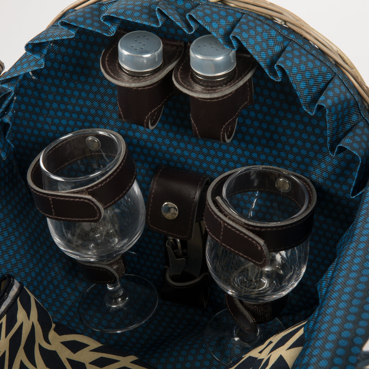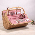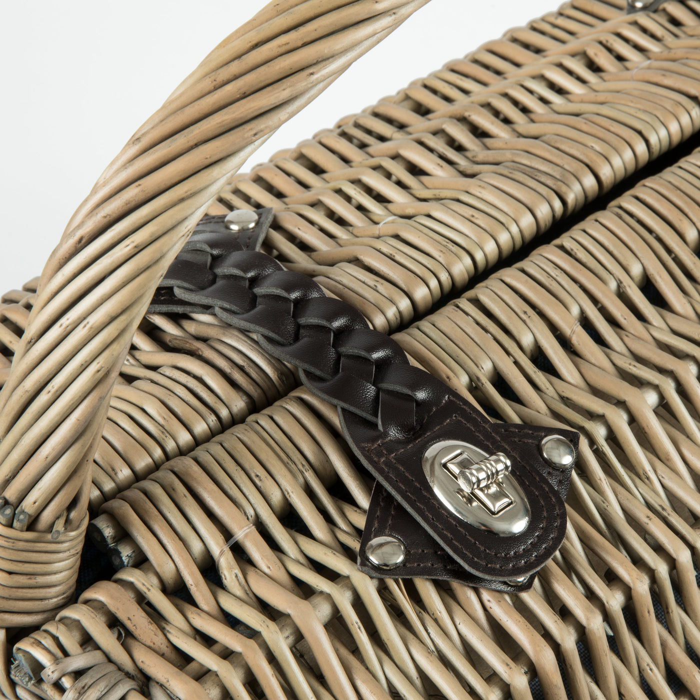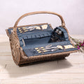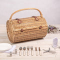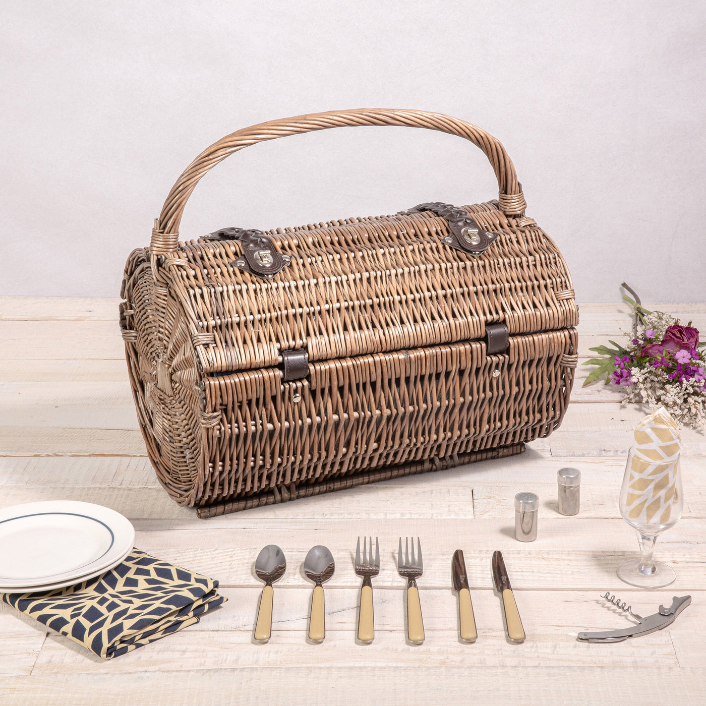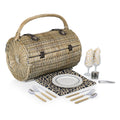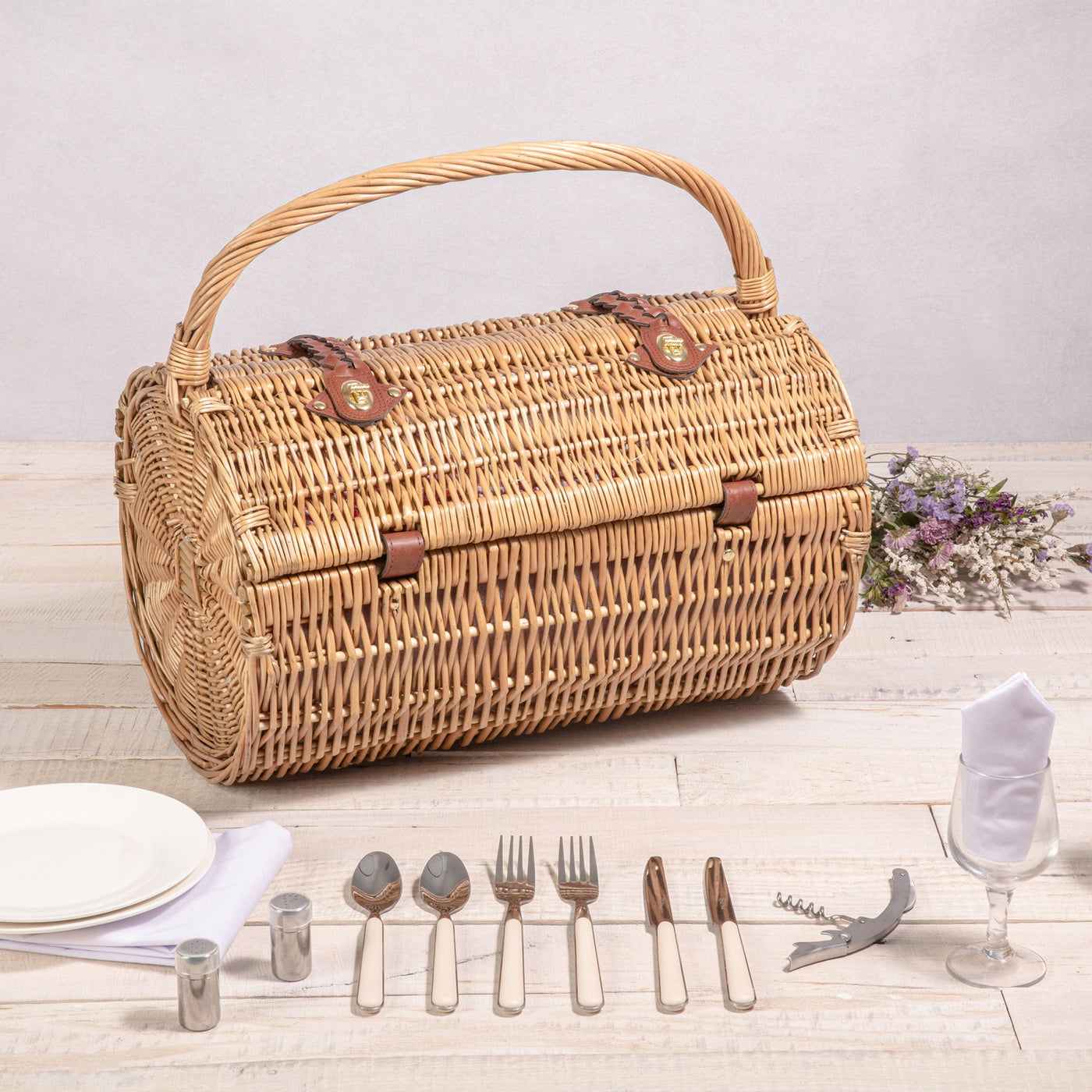Think outside the box... with a barrel! It may be hip to be square, but this design has us over a barrel! Sorry, couldn't help it. Still, the future of romantic couples picnic time may just lie in the rounded willow contours of the Barrel Wicker Picnic Basket for 2. Give the gift of a deluxe vintage English-style picnic set featuring wine and cheese service for two. This large handwoven willow-constructed wicker picnic basket comes equipped with two porcelain plates, stainless steel silverware, two hand-blown wine glasses, a salt & pepper shaker set, and a stainless steel waiter-style corkscrew. All items secure easily to the fully-lined interior of the picnic basket with sturdy leather straps. This picnic basket with lid also comes loaded with a durable lining and 100% cotton napkins and tablecloth. If you’re looking for a unique and thoughtful wedding or anniversary gifts for a favorite couple or your own special husband or wife, look no further. Whether you're at the park or beach, roll out the Barrel to keep the squares from ruining the picnic.