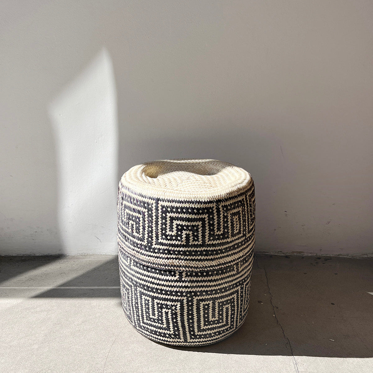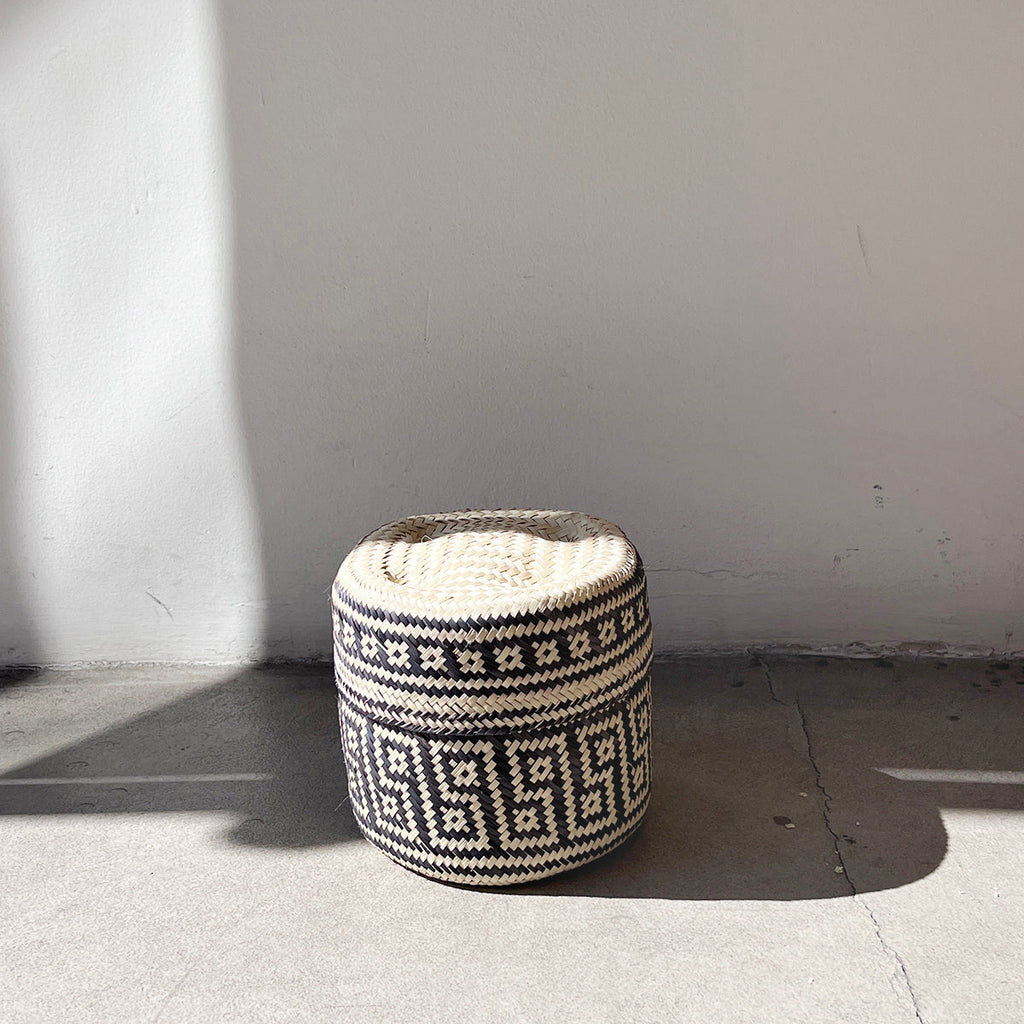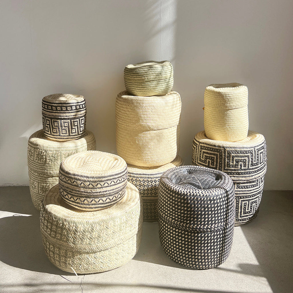 Black and Natural Woven Palm Baskets with Lid