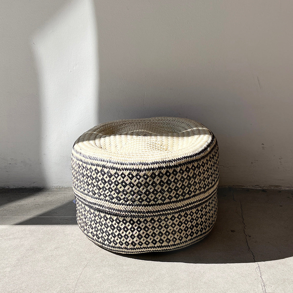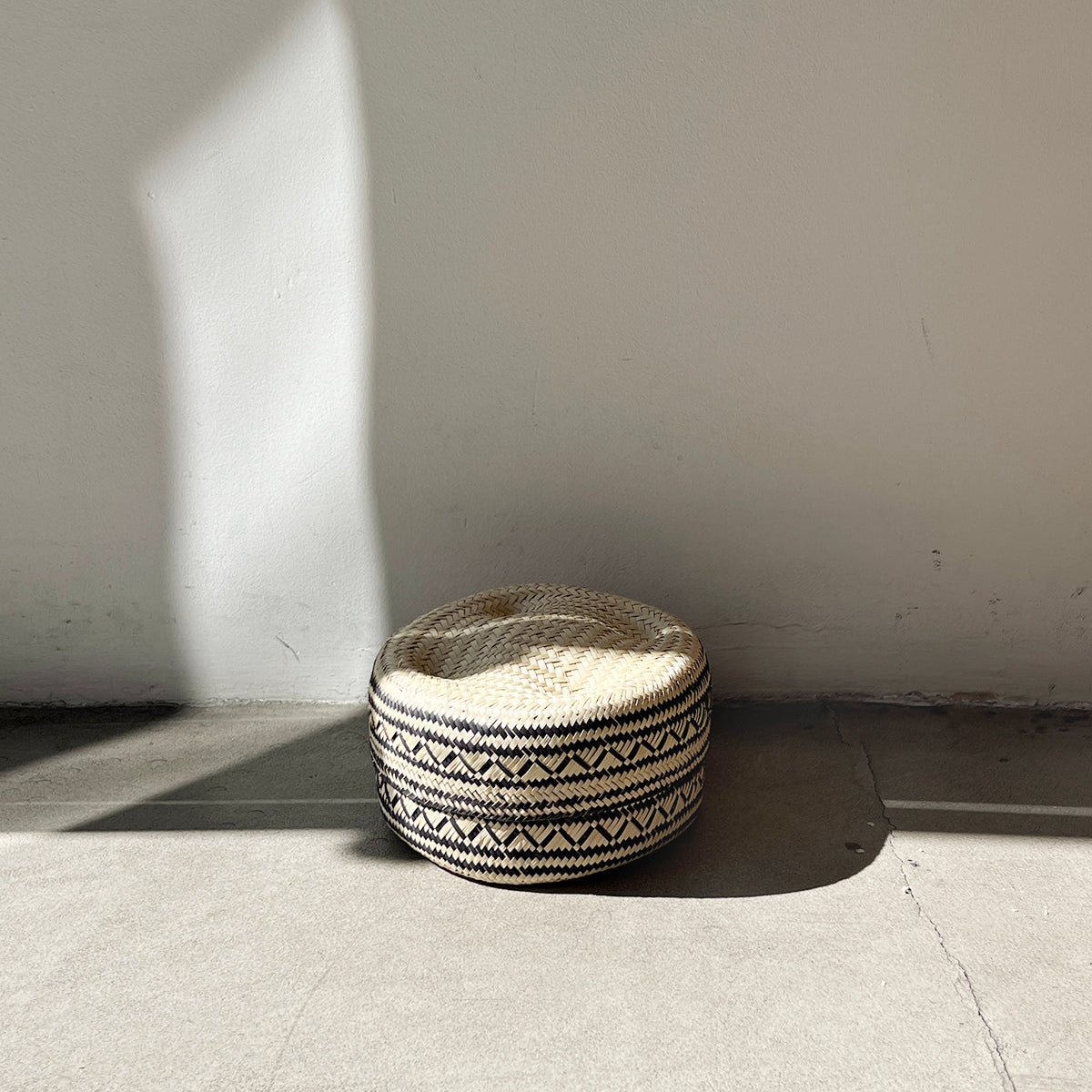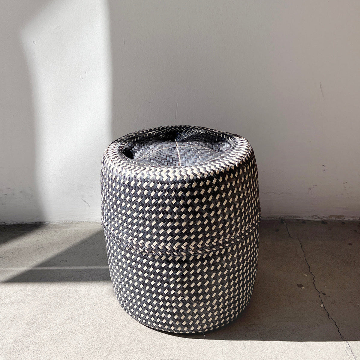 Black and Natural Woven Palm Baskets with Lid