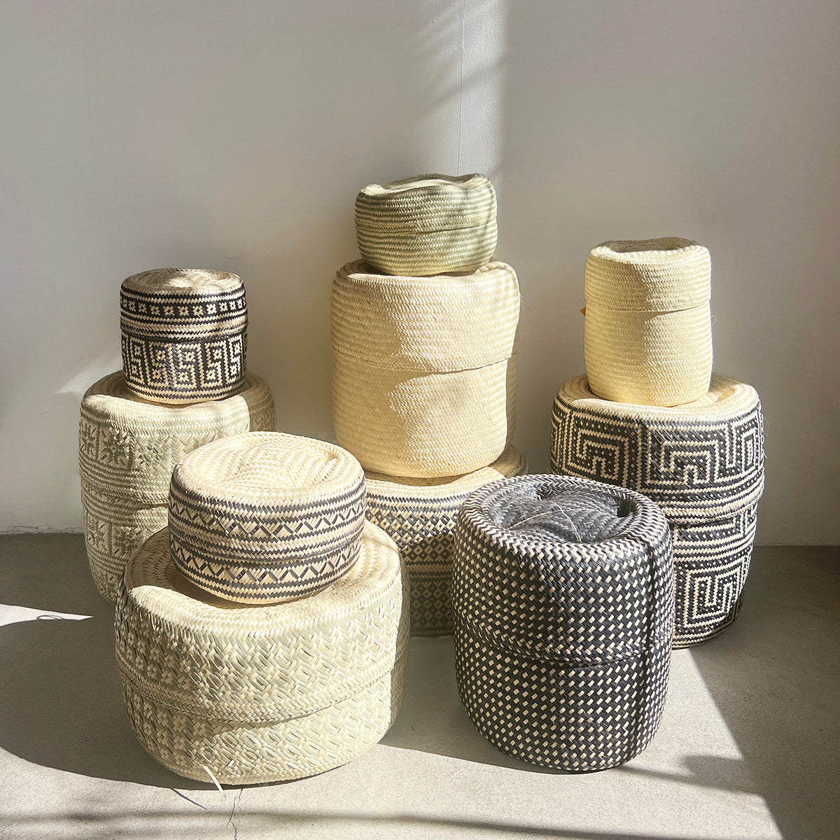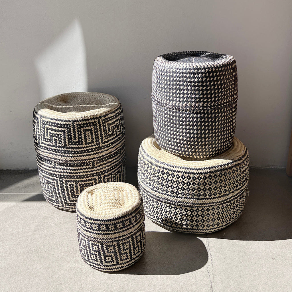 Add a touch of rustic charm to your home with our handwoven basket set. Made from undyed natural palm fibers and dyed black, these baskets feature unique geometric patterns and come in various shapes and sizes. Perfect for stylish storage solutions.