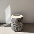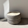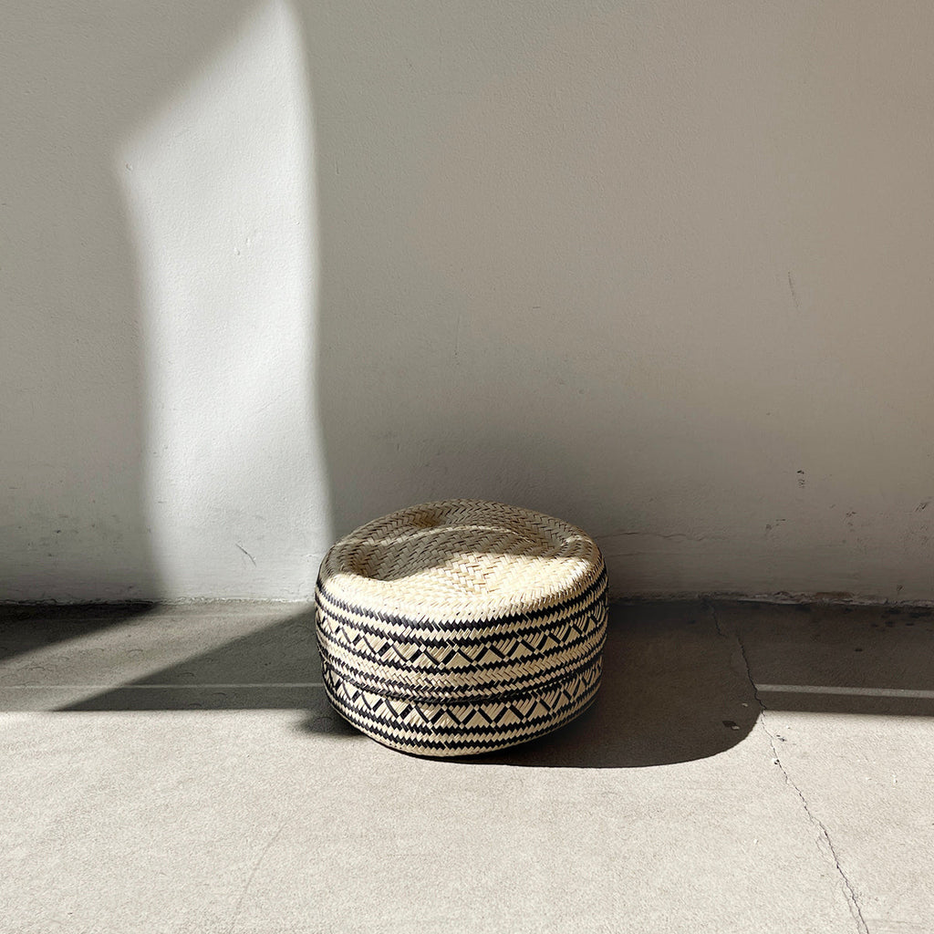 These handwoven palm basket are made with natural light beige un-dyed palm fiber with geometric pattern designs in black. Each basket comes with a matching lid that closes over it for a clean look. They are round in shape, and come in five different sizes, each one displaying different patterns (large, wide, medium, small and extra small). Perfect to store small to medium items in your bedroom, office, bathroom and family room.