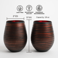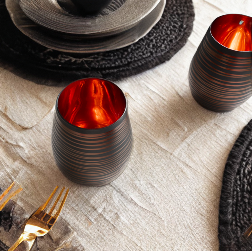Our absolute best seller. These black swirl stemless glasses are the perfect way to spice up your decor and replace your traditional glasses. Featuring an exquisite matte glass exterior, electroplated copper colored interior, and a beautiful swirl design, these glasses are crafted to elevate any table setting and dining space in a completely unique way. They don't belong in a cabinet.
