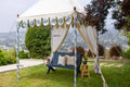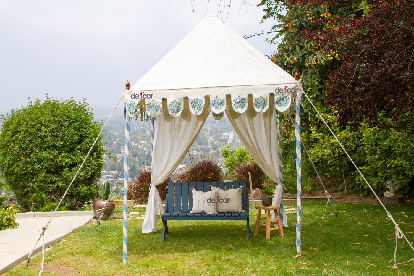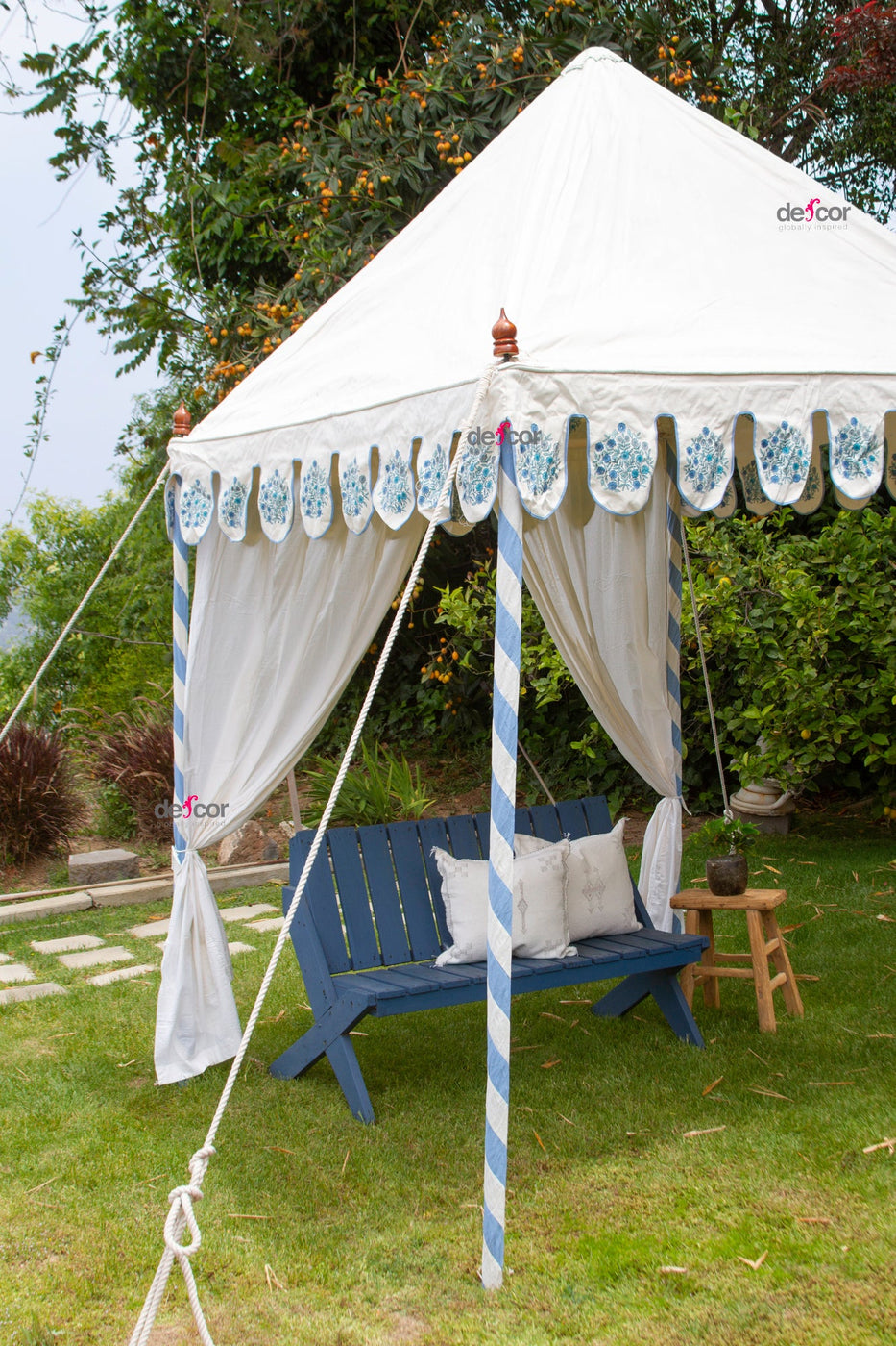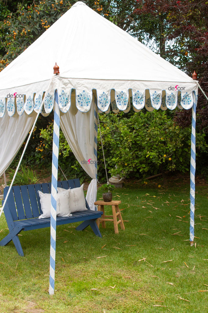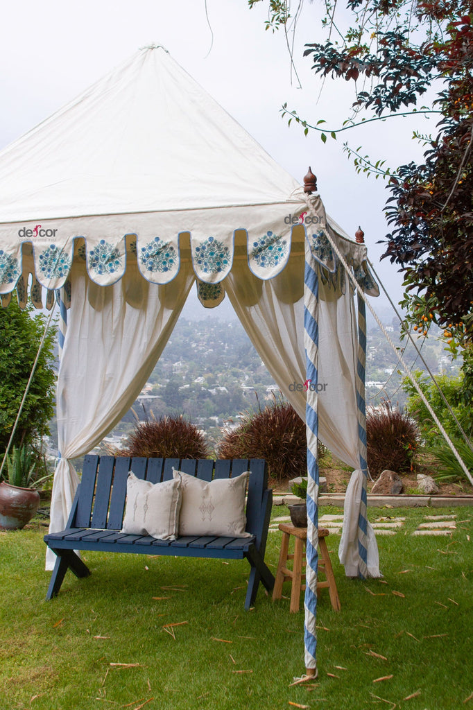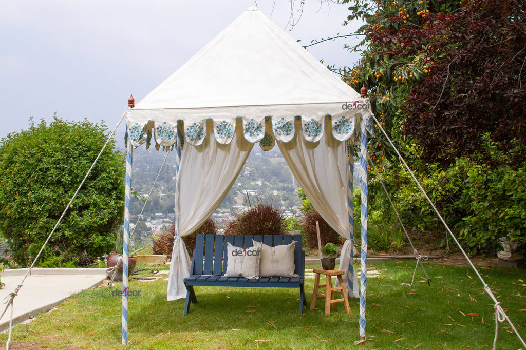 Bring a unique style to your outdoor space with this beautiful block-print garden canopy tent. Part of Indian culture and tradition, our chhatris are handcrafted from strong, waterproof canvas with a modern cubic shape and pitched roof. This traditional Indian-inspired decorative stands on bamboo poles with iron ends, perfect for any patio setting.