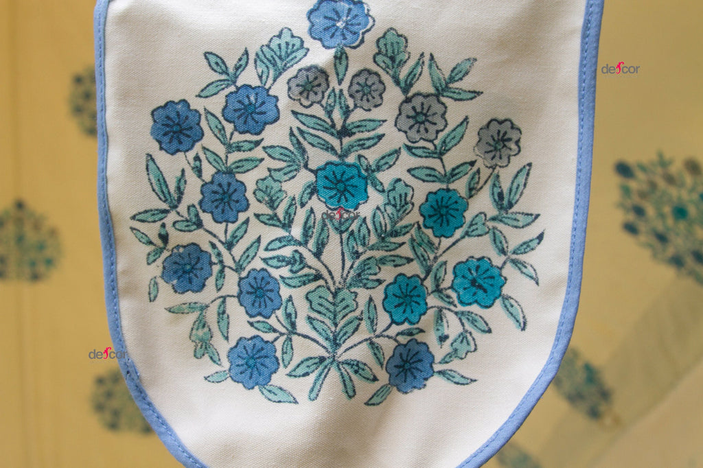 This De-cor exclusive design was constructed by skilled artisans in Northwest India, the canvas features a traditional block print design, which is a method of printing patterns onto fabric using carved wooden blocks. The design of this block print is that of traditional Royal India, with a bouquet of flowers showing in a variety of variety of blue colors on white canvas fabric.