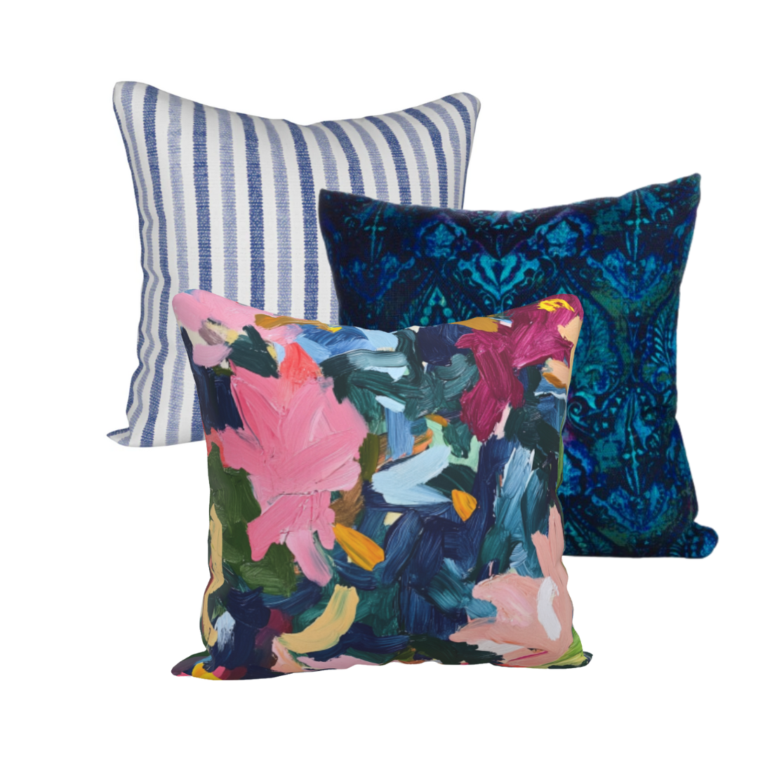 This floral brings artistic tension to crisp stripes and rich solids. Try it with: