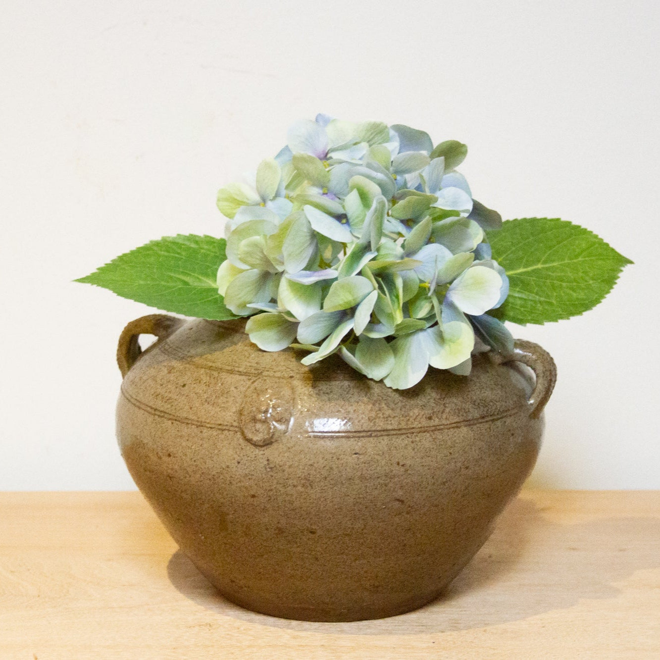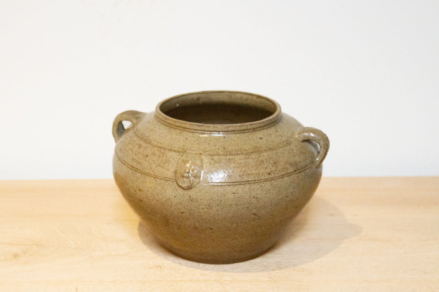 Vintage Chinese Yue ware porcelain vase. The vase, of tapered ovoid form, boasts two raised handles and a striking dragon face design. Its surface is meticulously covered both inside and out with a captivating mottled brown glaze, halting at the unglazed bottom for an authentic touch. The dragon face design adds a mythical and powerful element to the piece, enhancing its visual appeal.
