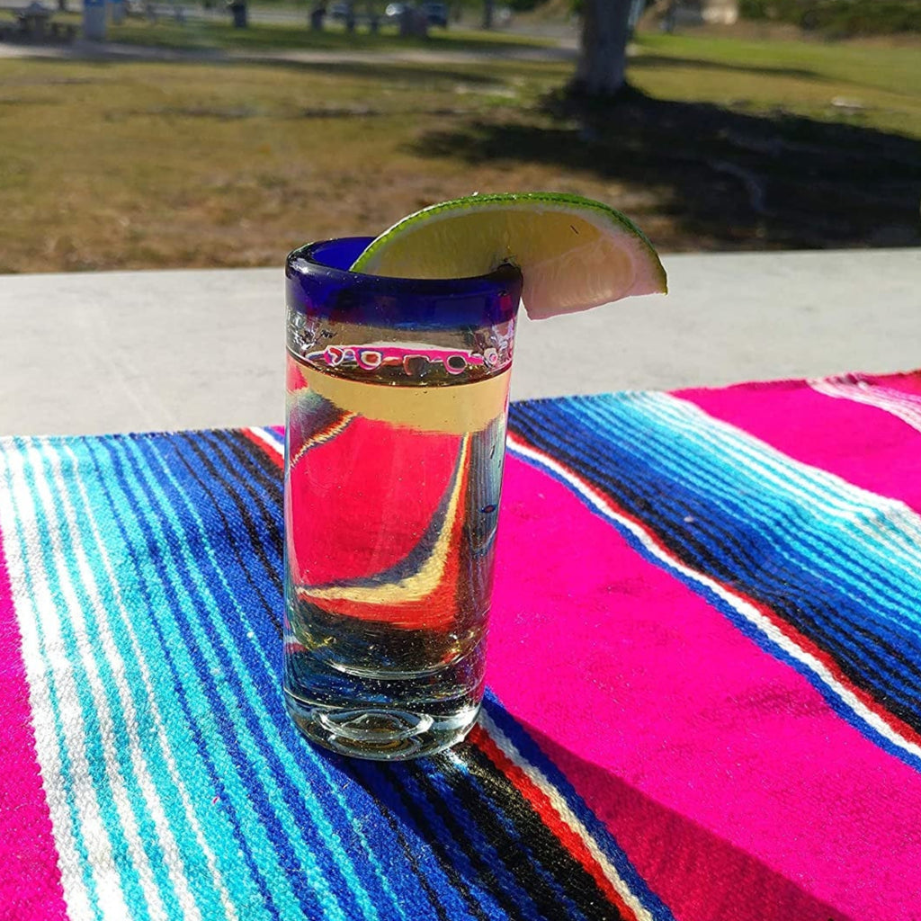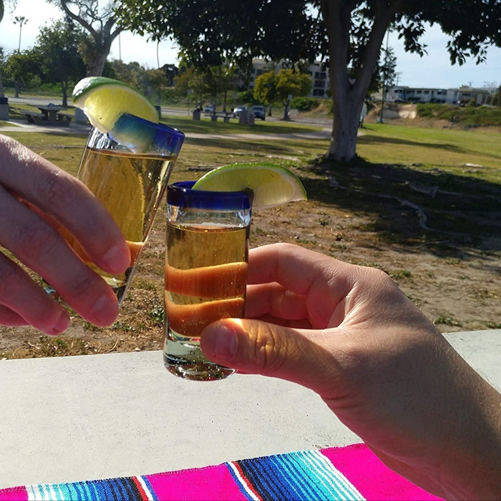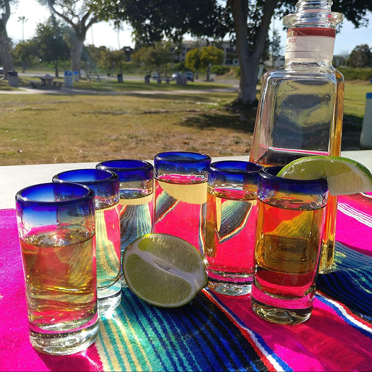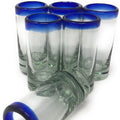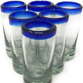 This traditional set of 6 hand blown tequila shot glasses with blue rims is perfect for your next fiesta! Use them to serve tequila or your favorite liquor of choice. The set adds a great sense of elegance to the dining room that will be enjoyed by everyone. Each blown glass is made by the hands of skilled artisans, may vary slightly in size and show tiny bubbles within the glass that develop from the blowing process. Lead-free, made from sustainable recycled glass. Hand-washing recommended, but dishwasher safe on the top rack. Exceptional artisan quality, thick and sturdy glass. Proudly hand made in Mexico.