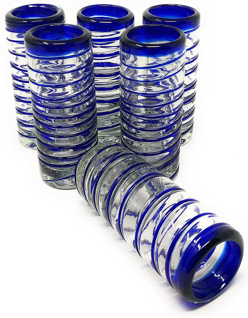 This traditional set of 6 hand blown tequila shot glasses with a blue spiral design is perfect for your next fiesta! Use them to serve tequila or your favorite liquor of choice. The set adds a great sense of elegance to the dining room that will be enjoyed by everyone. Each blown glass is made by the hands of skilled artisans, may vary slightly in size and show tiny bubbles within the glass that develop from the blowing process. Lead-free, made from sustainable recycled glass. Hand-washing recommended, but dishwasher safe on the top rack. Exceptional artisan quality, thick and sturdy glass. Proudly hand made in Mexico.