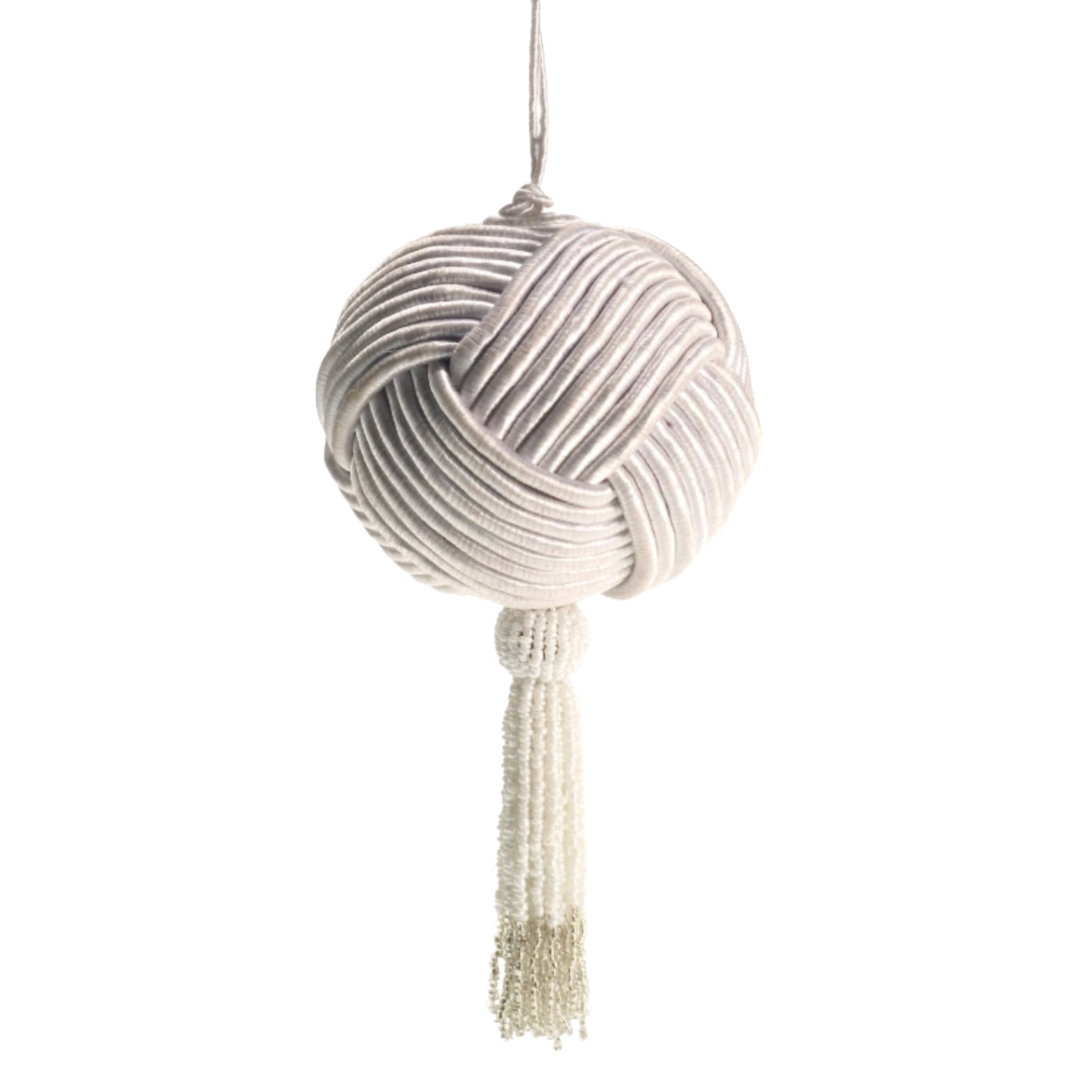 Hang this substantial 3" diameter corded ball on your tree or from a door knob with its delightful hand 3.5" tassel made of recycled glass beads.