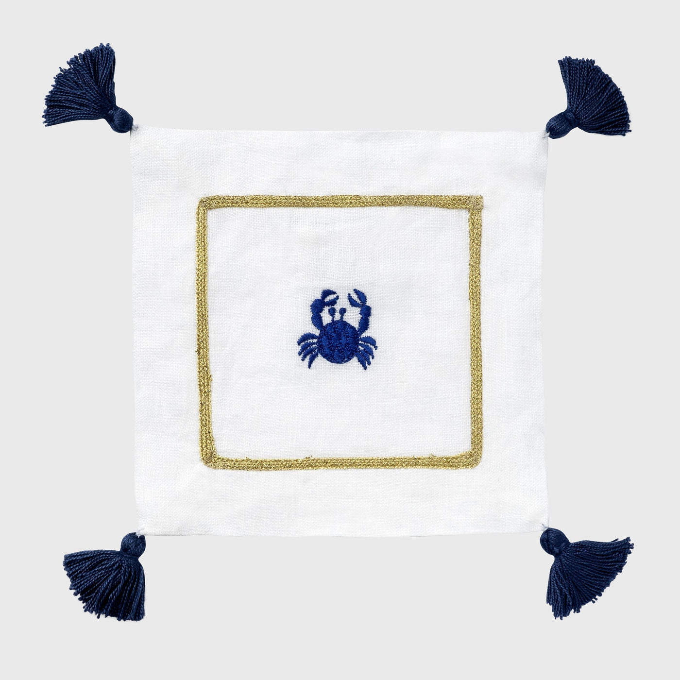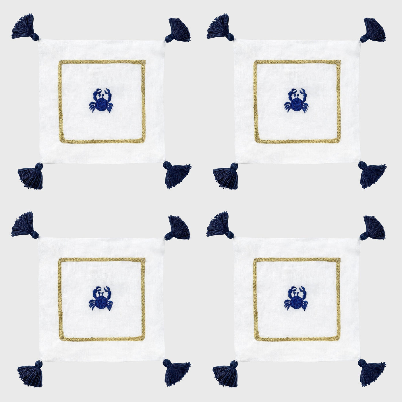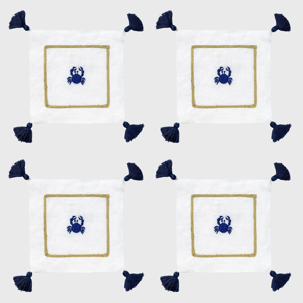 The perfect addition to any coastal barcart. Beautiful white linen cocktail napkins with a bold embroidered crab and fun tassels... what a way to say 'beach party!' These would make a wonderful hostess gift for all of your beach house visits!